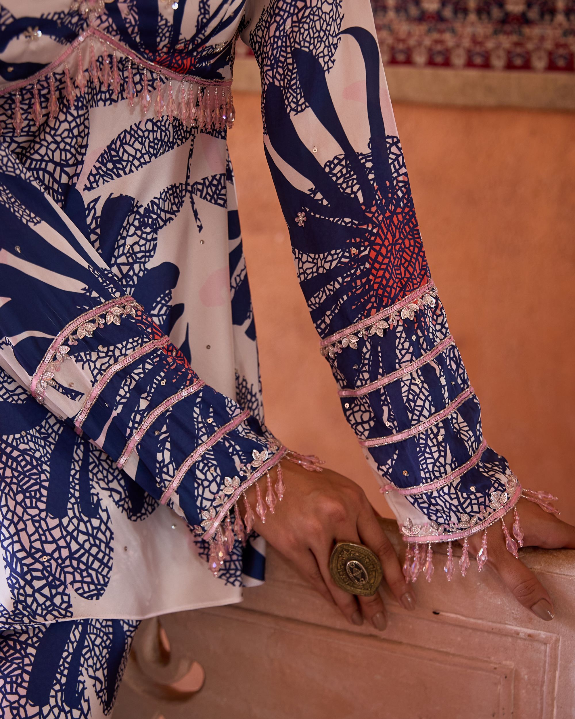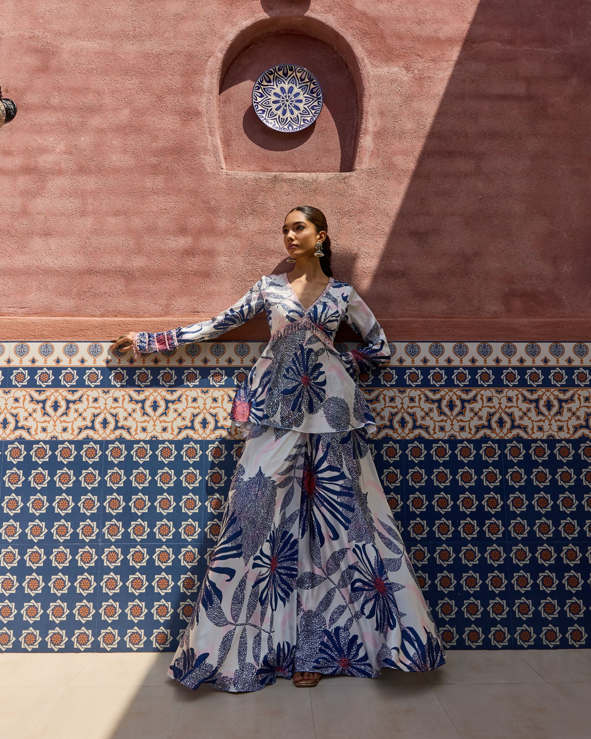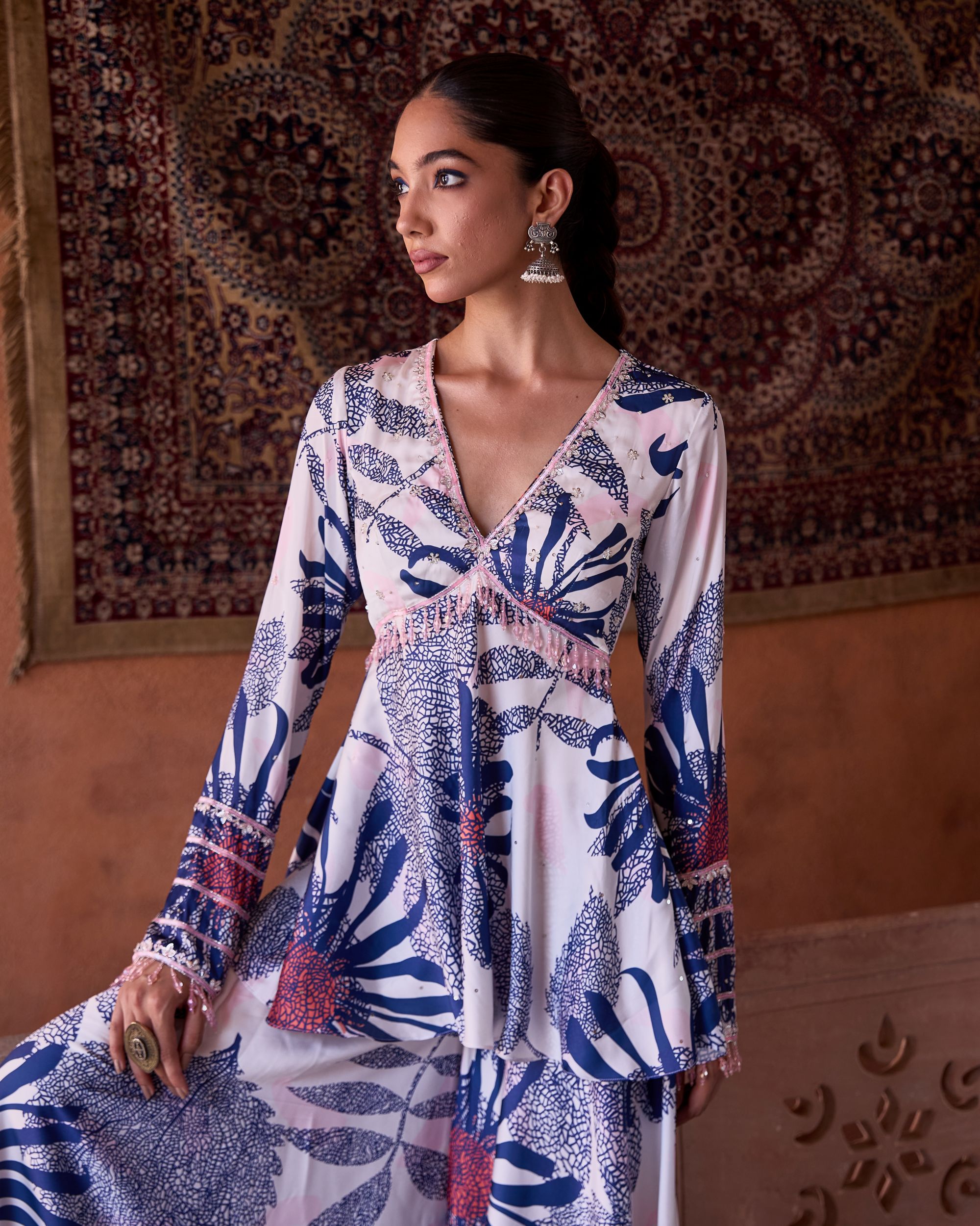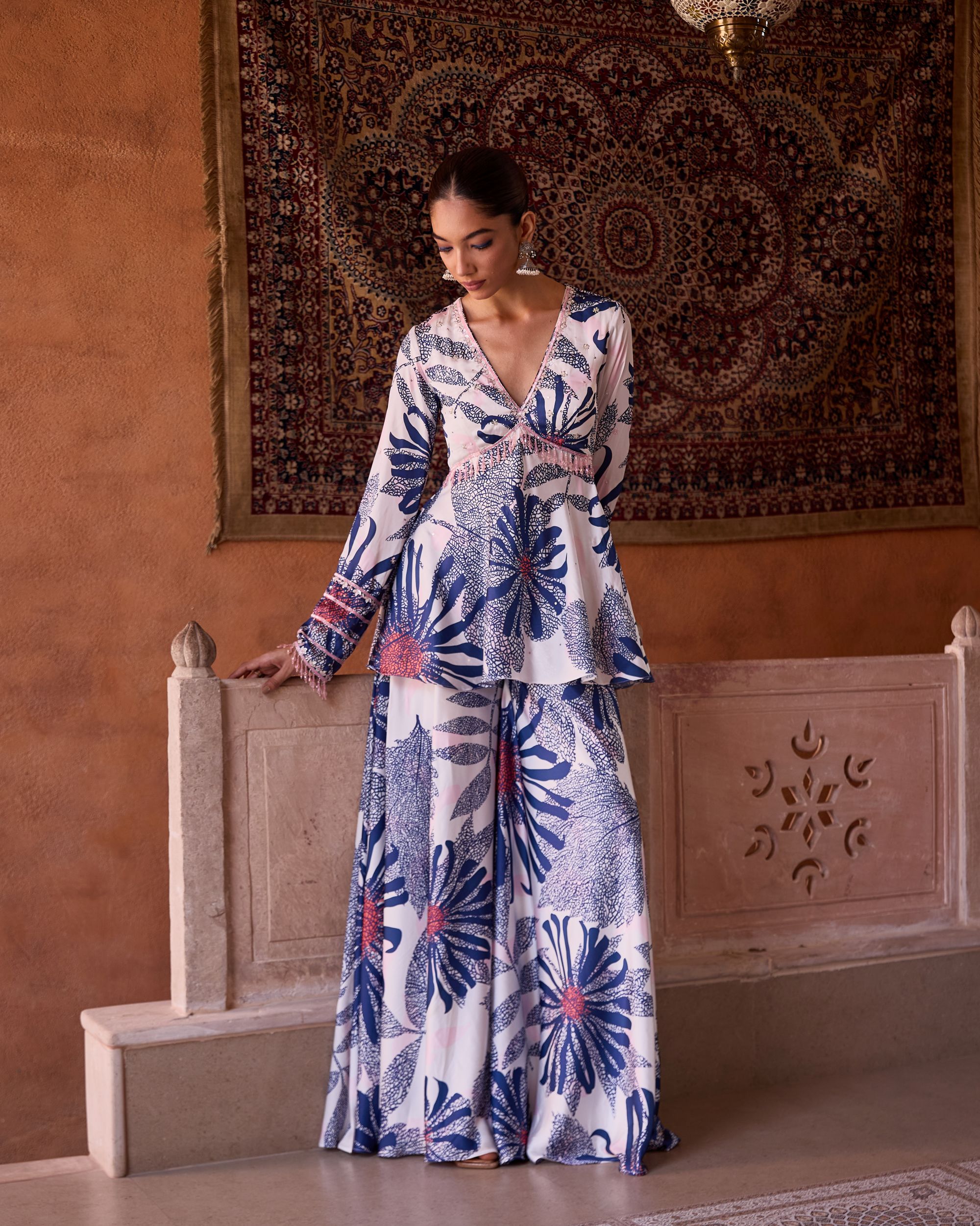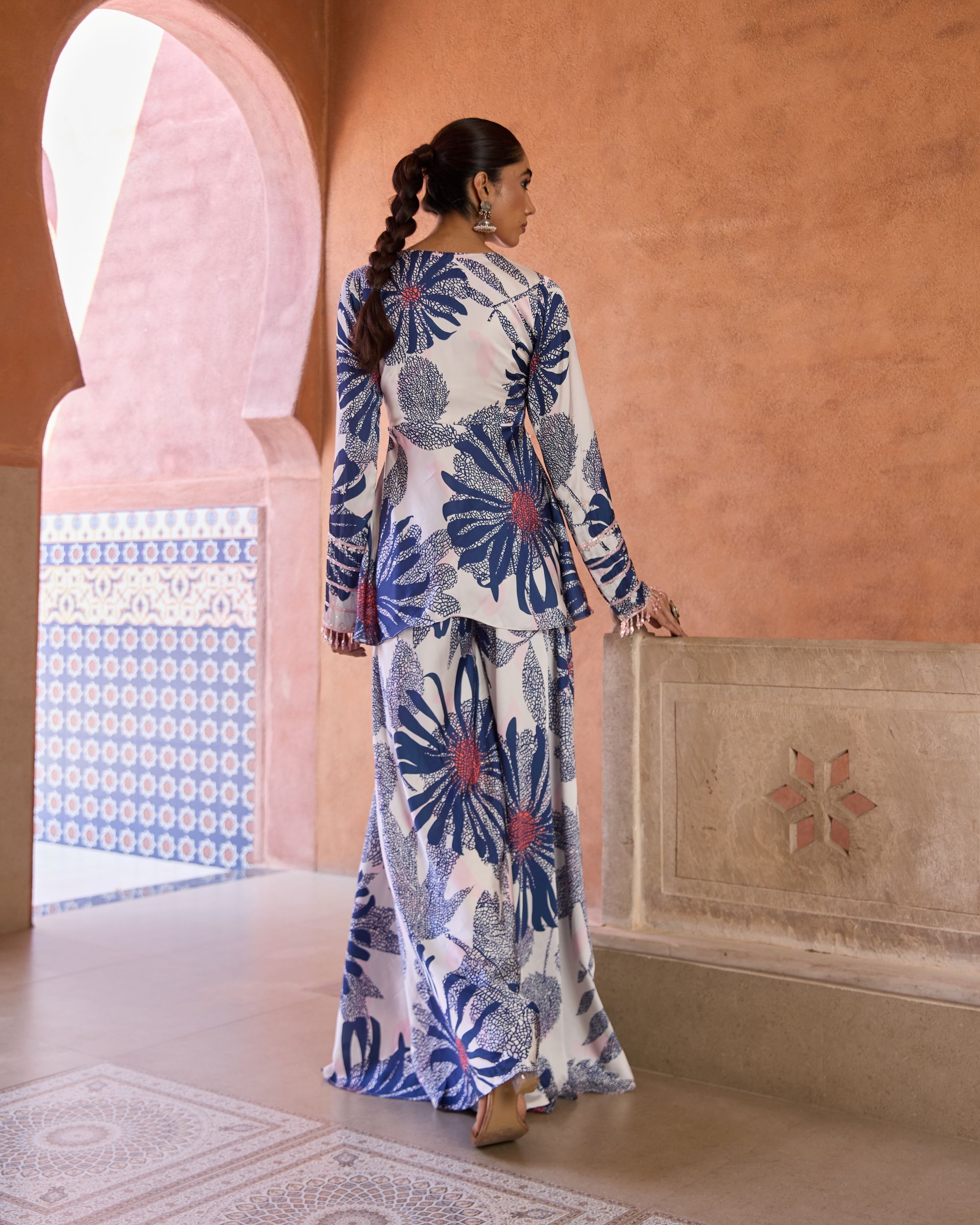 The ARZU Set features a hand-embroidered peplum top paired with wide-leg trousers. Adorned with intricate detailing and bold floral prints in shades of blue and coral, it blends artisanal craftsmanship with a breezy, modern silhouette—perfect for festive evenings or chic getaways.