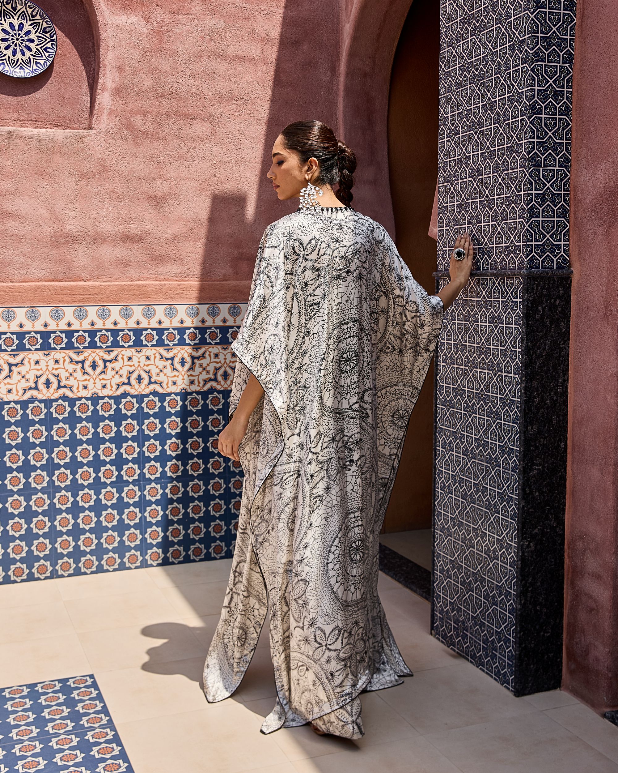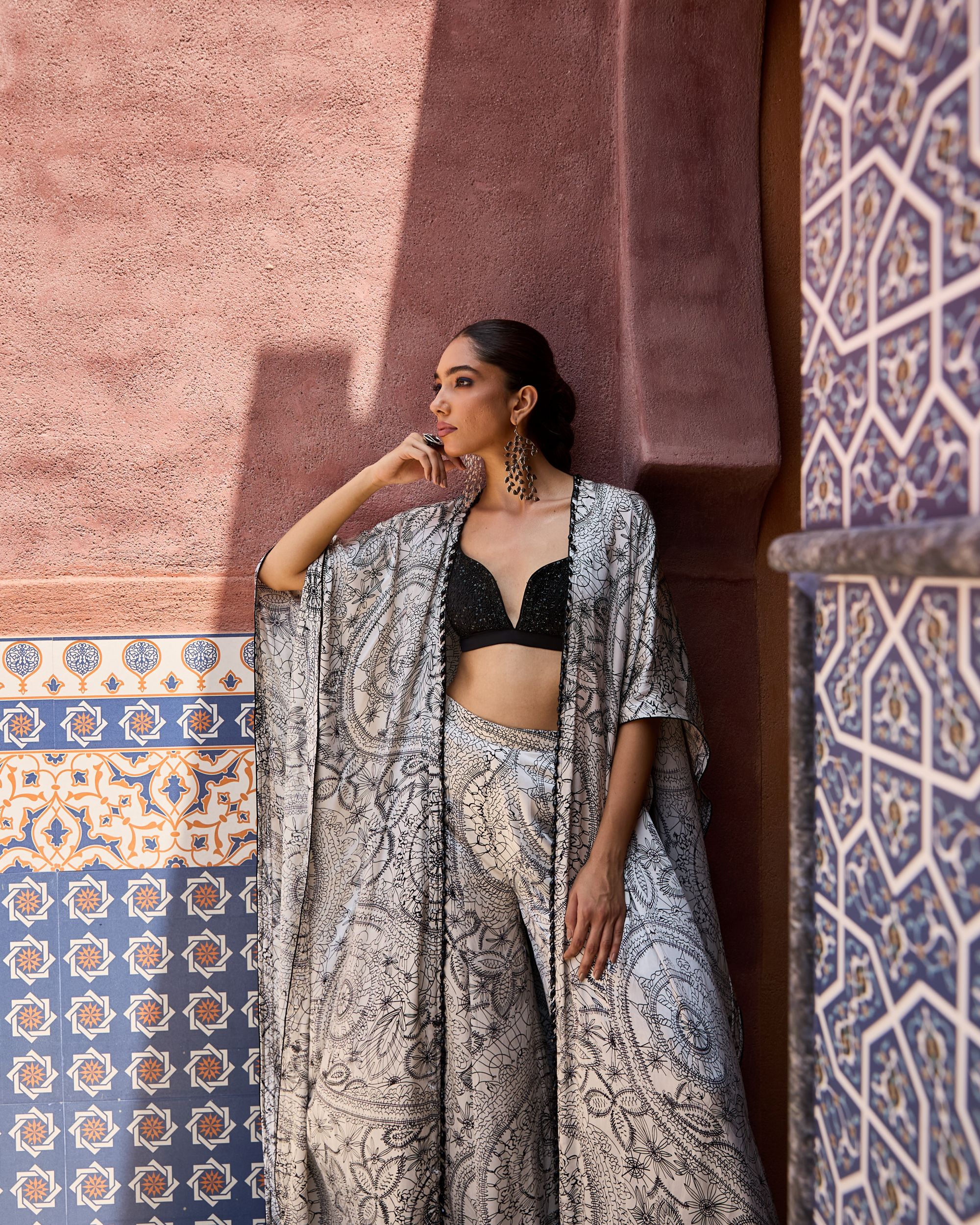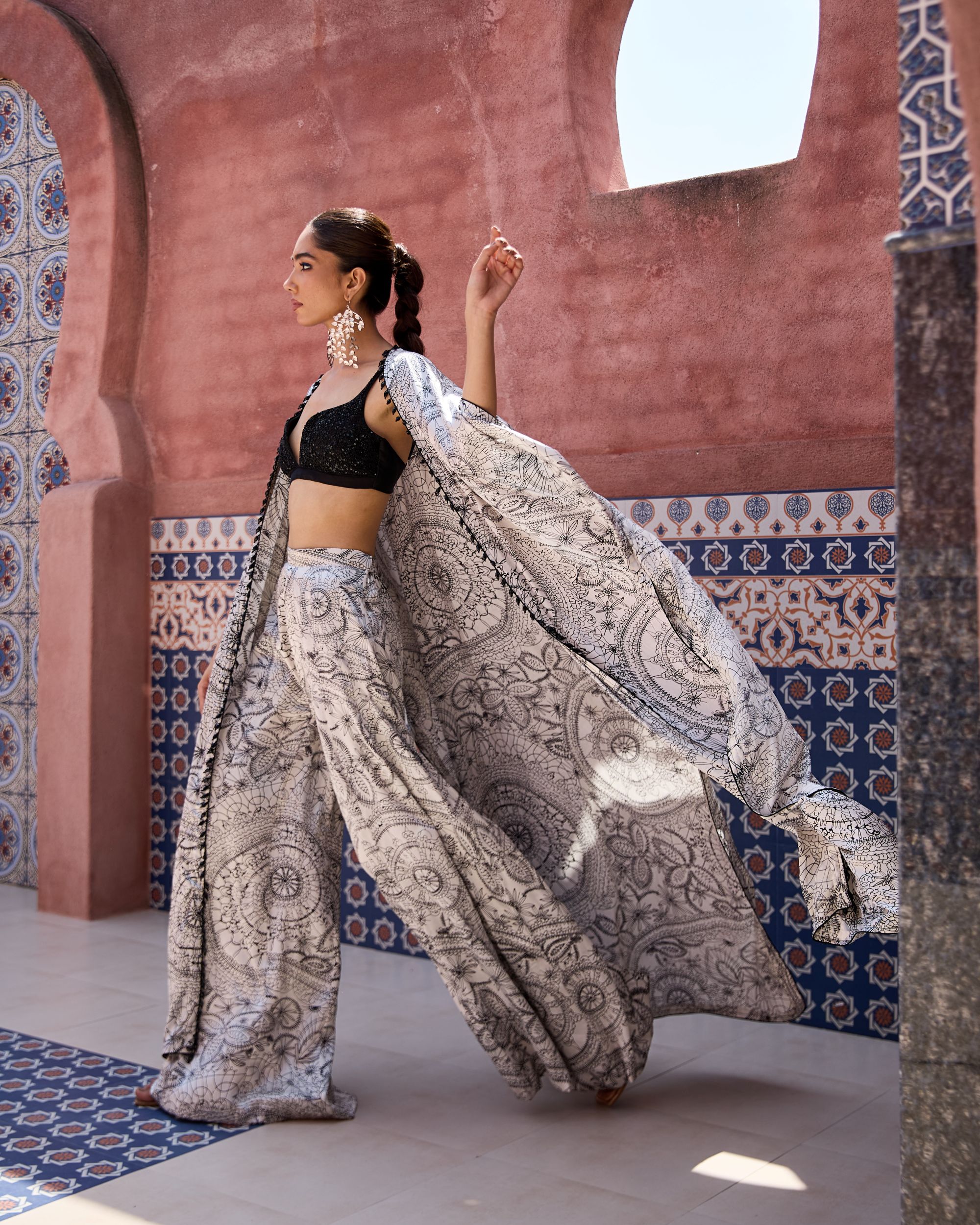 The Aayat Set is a luxe three-piece ensemble featuring a hand-embroidered bralette, sharara pants, and a flowing cape. Designed in intricate mandala-inspired prints with delicate detailing, it brings together timeless artistry and modern elegance. A statement choice for festive nights and grand celebrations.