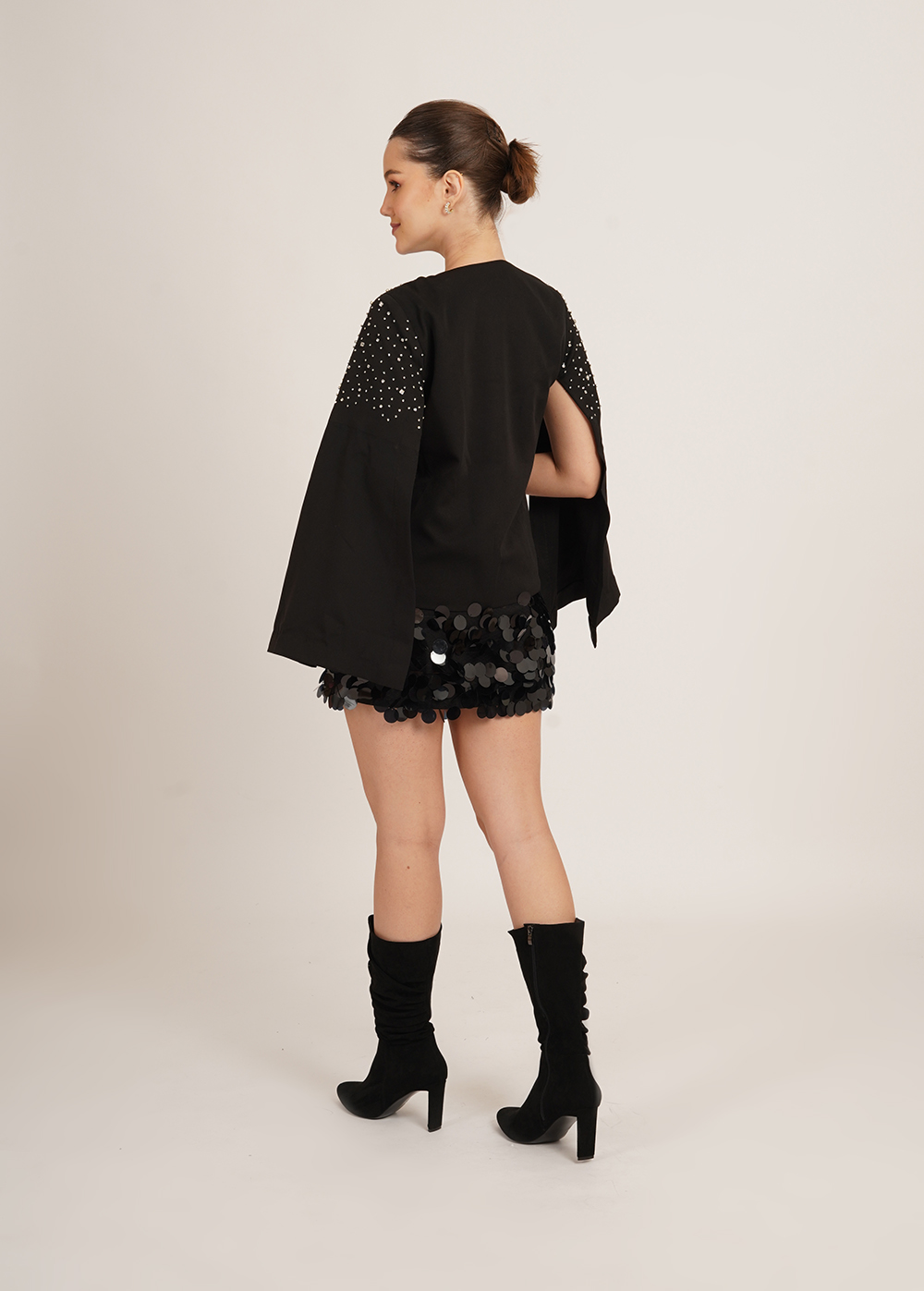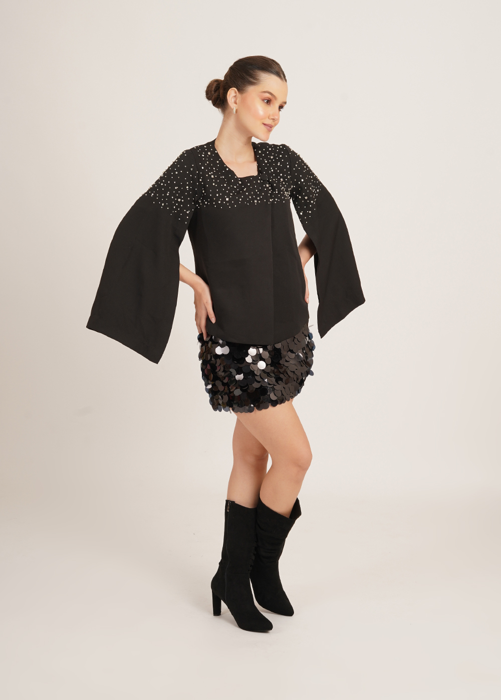 Description- A statement sequin mini skirt designed to pair seamlessly with the After Glow Evening Top, adding bold movement and luminous shine.
