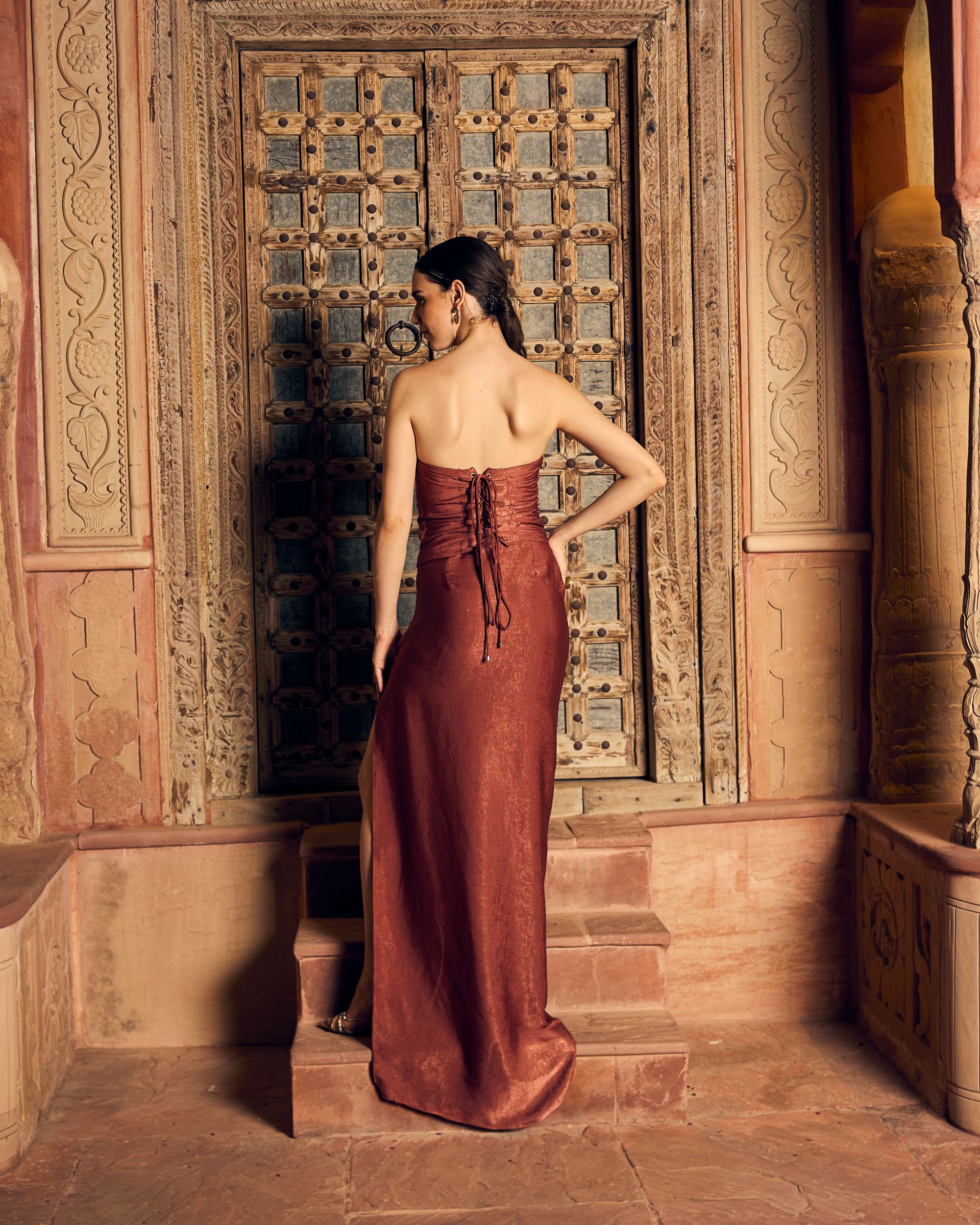 Keep the look sleek with statement earrings, minimal heels, and a clean low bun to let the outfit stand out.