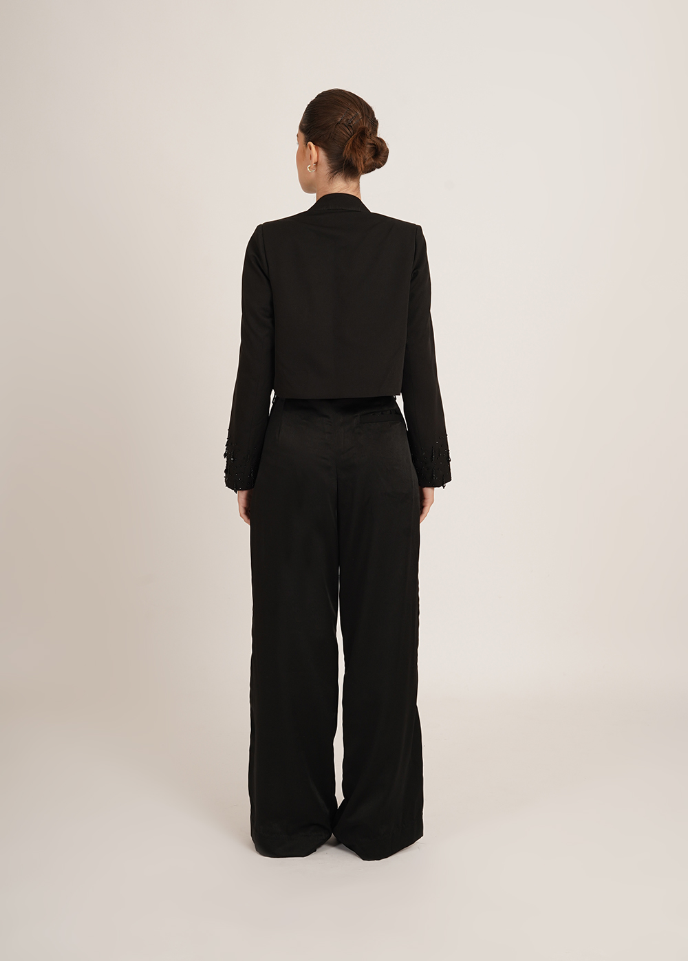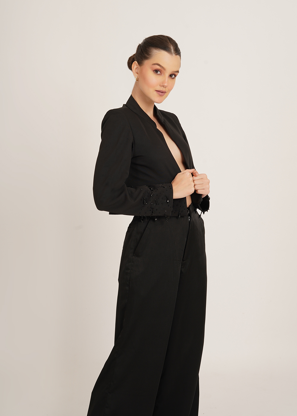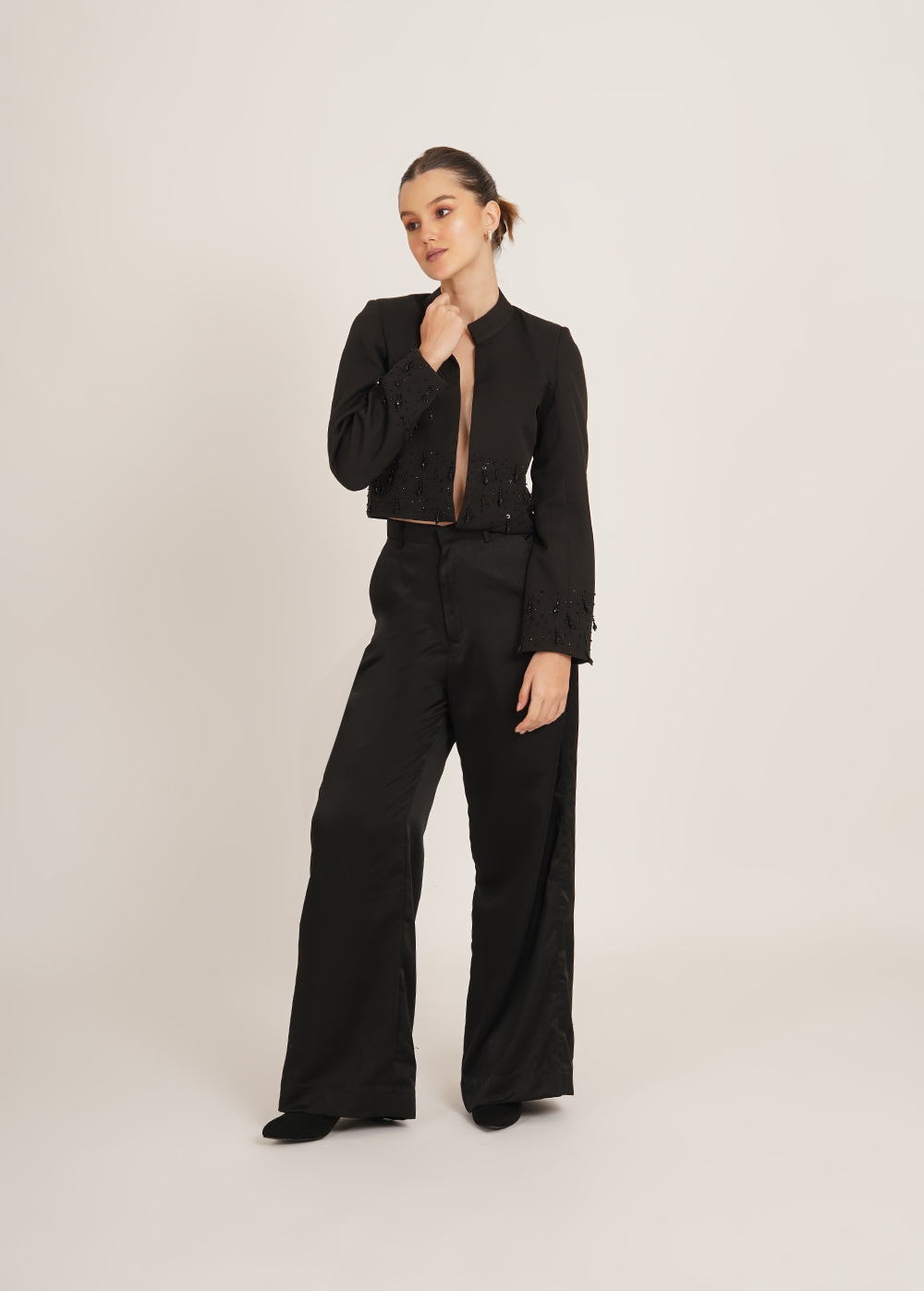 Description: A refined statement for after-dark dressing. This cropped jacket features a sleek mandarin collar and intricate handwork detailing that adds depth and subtle shine to its clean silhouette. Polished yet bold, it's designed to elevate any look with ease.