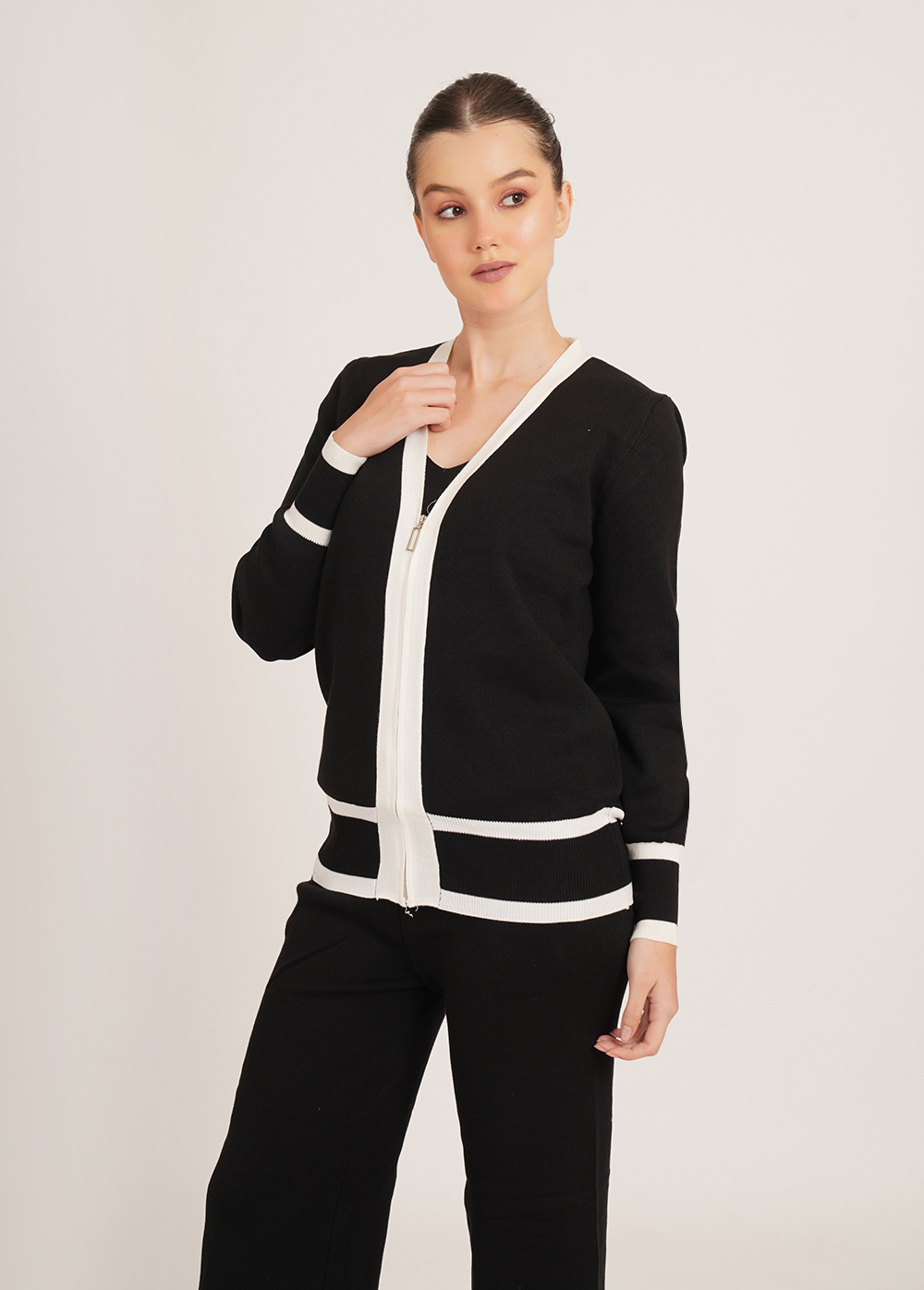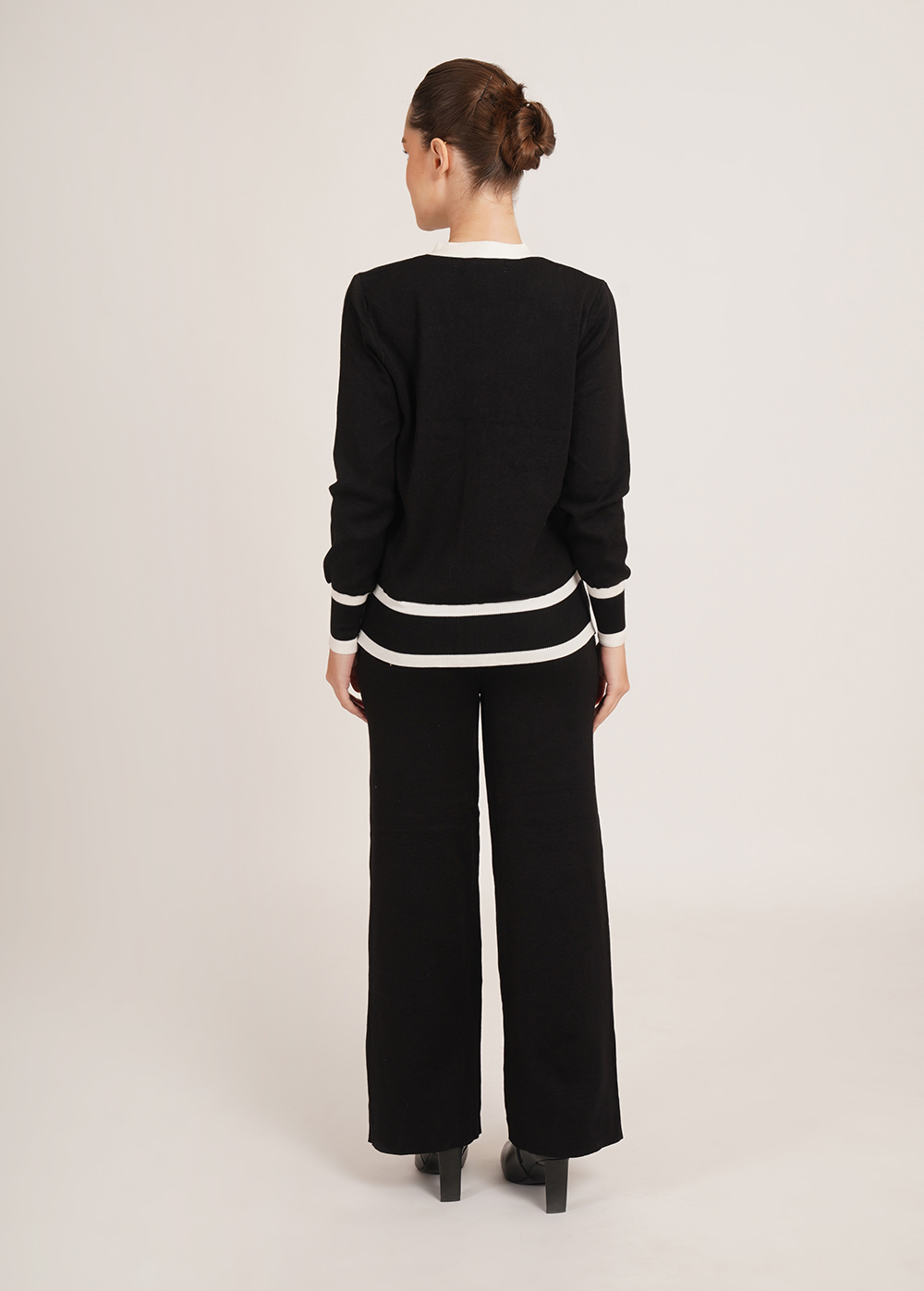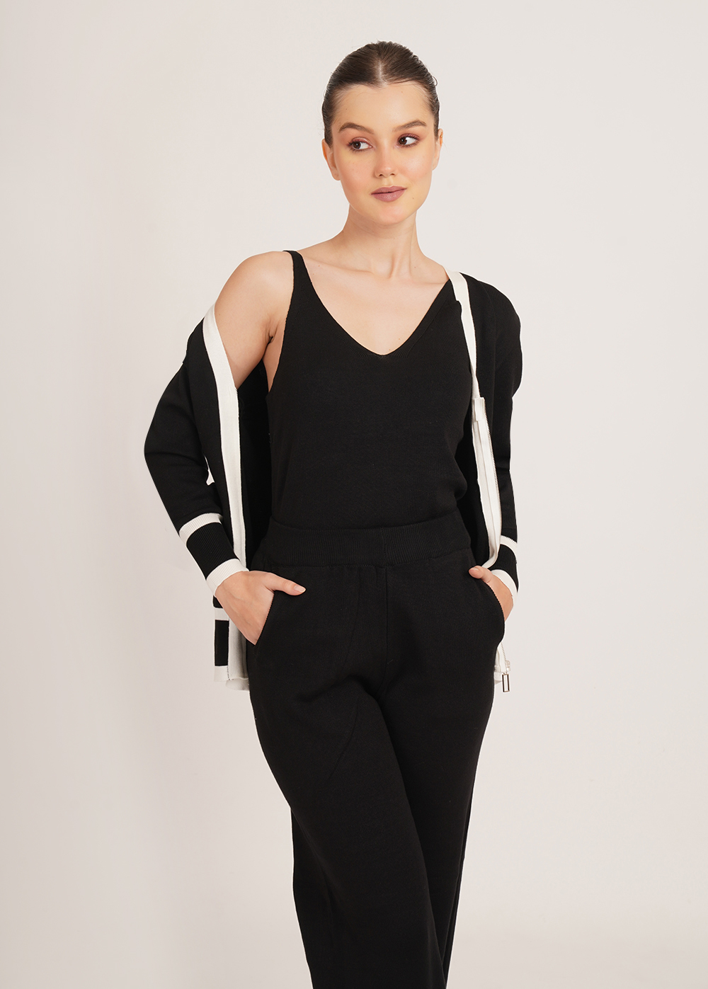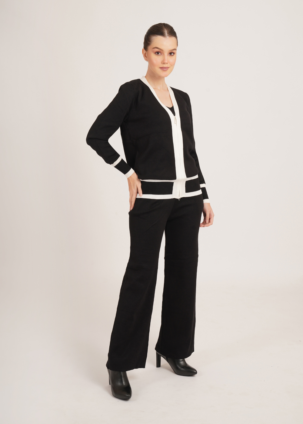 Description: Clean lines meet cosy comfort. Crafted in a soft winter knit, this coordinated set features a zip-front cardigan, inner layer, and relaxed trousers for a clean, polished look.Styling Tip: Pair with ankle boots for effortless winter chic, or wear the cardigan open with denim for a casual edit.
