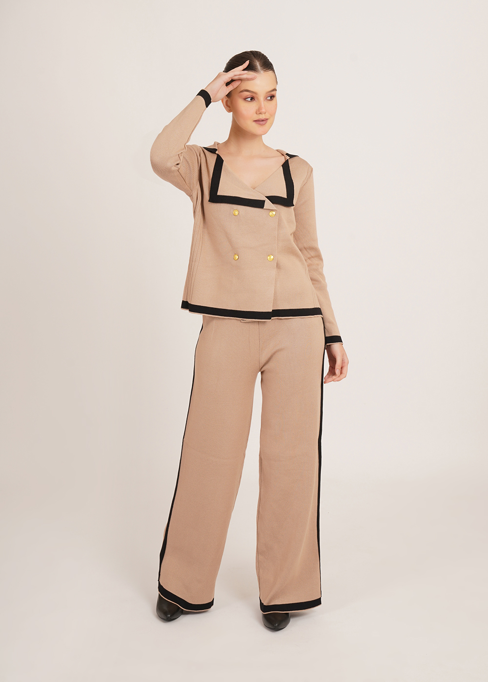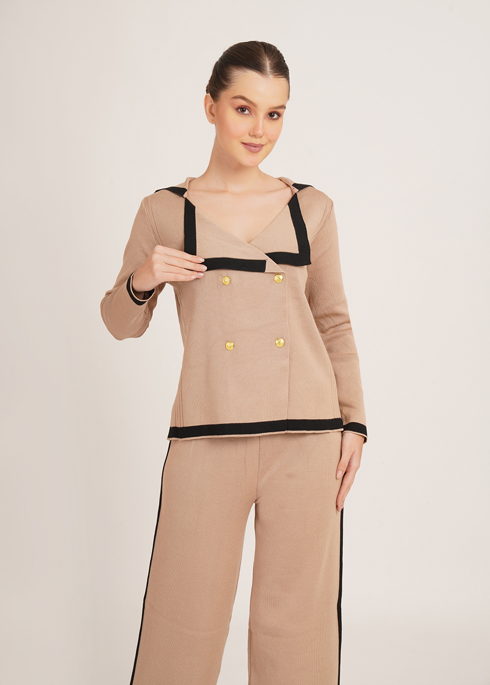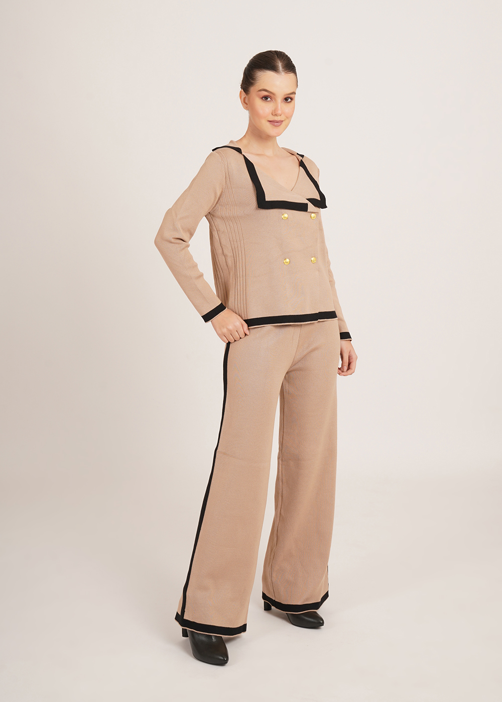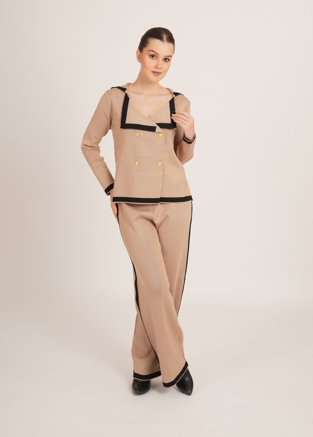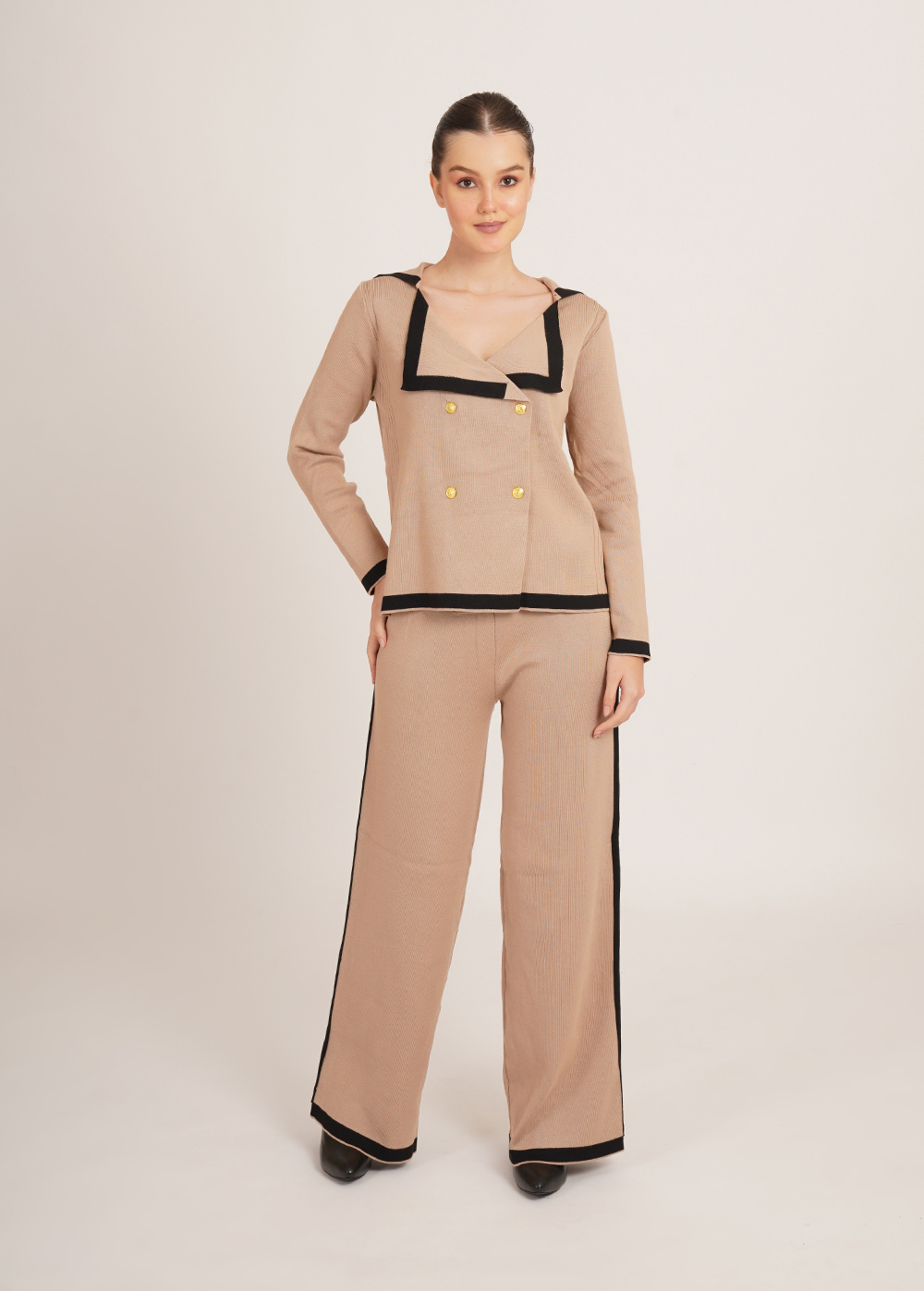 Description: Warm tones meet sharp tailoring. Crafted in a soft, winter-friendly knit, the Cinnamon Set features a structured jacket-style top with contrast detailing and coordinated wide-leg trousers for a refined yet effortless silhouette.