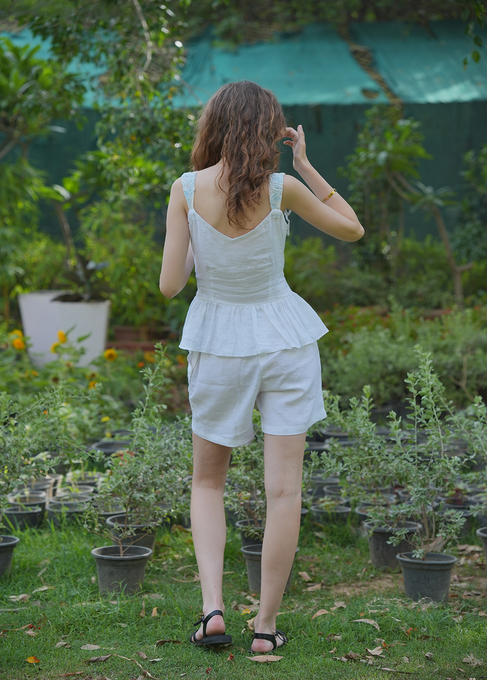 The Daisy Set features a cutwork peplum top paired with crisp white linen shorts—fresh, feminine, and perfect for warm, sunny days.