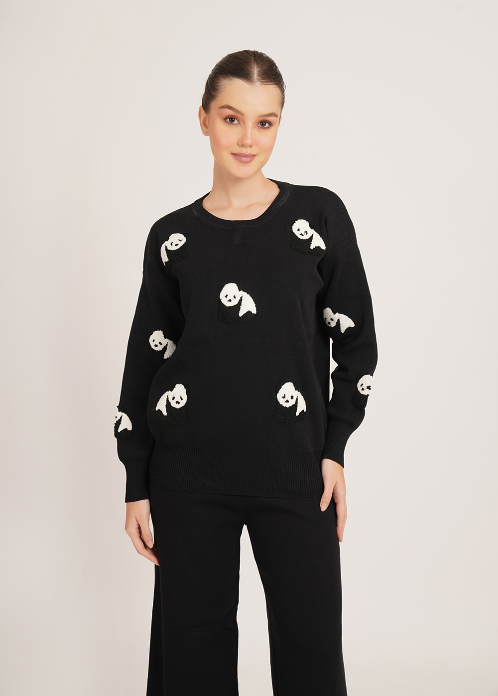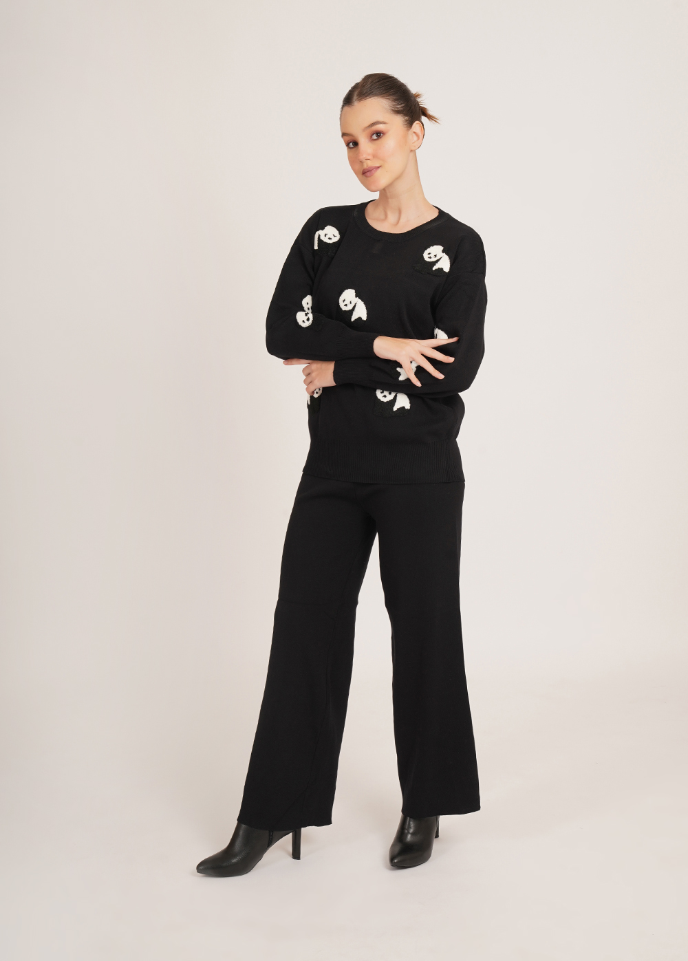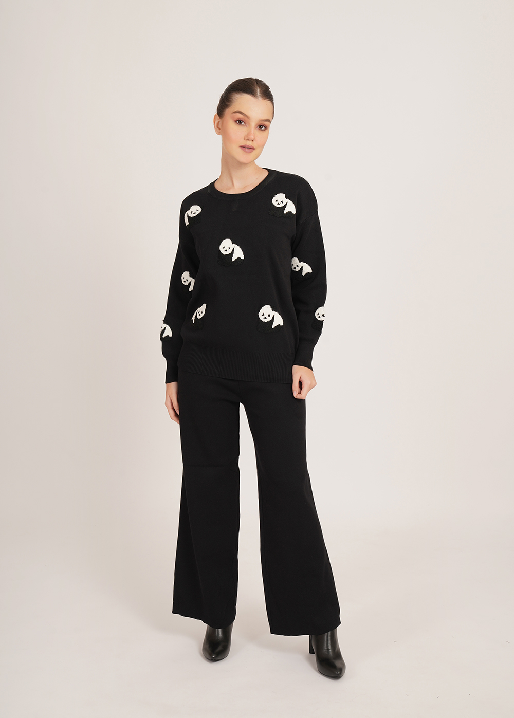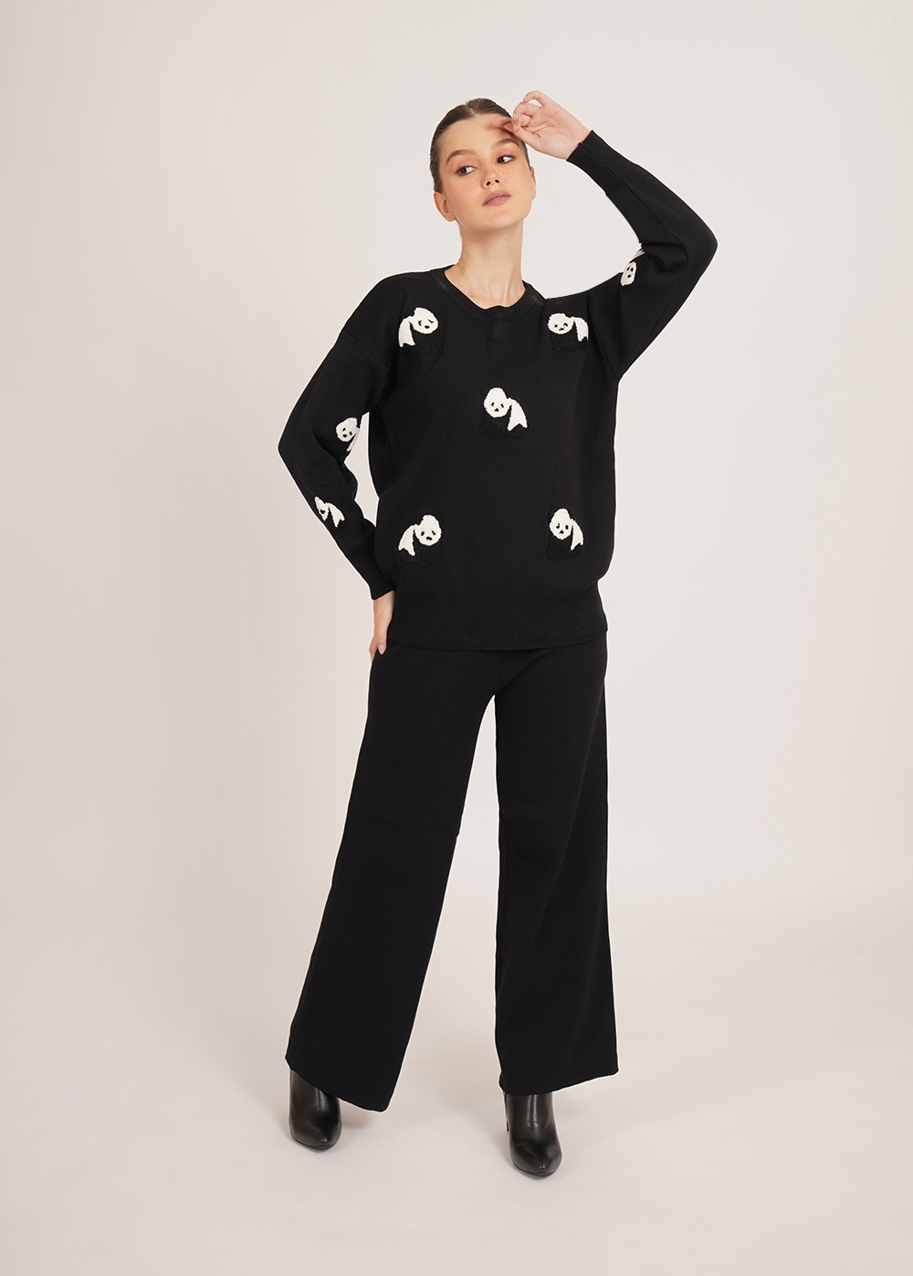 Winter basics, but make them playful. Crafted in a soft, cozy knit, this black co-ord features subtle panda motifs that add a fun contrast to a classic silhouette—warm, comfortable, and effortlessly cool.-