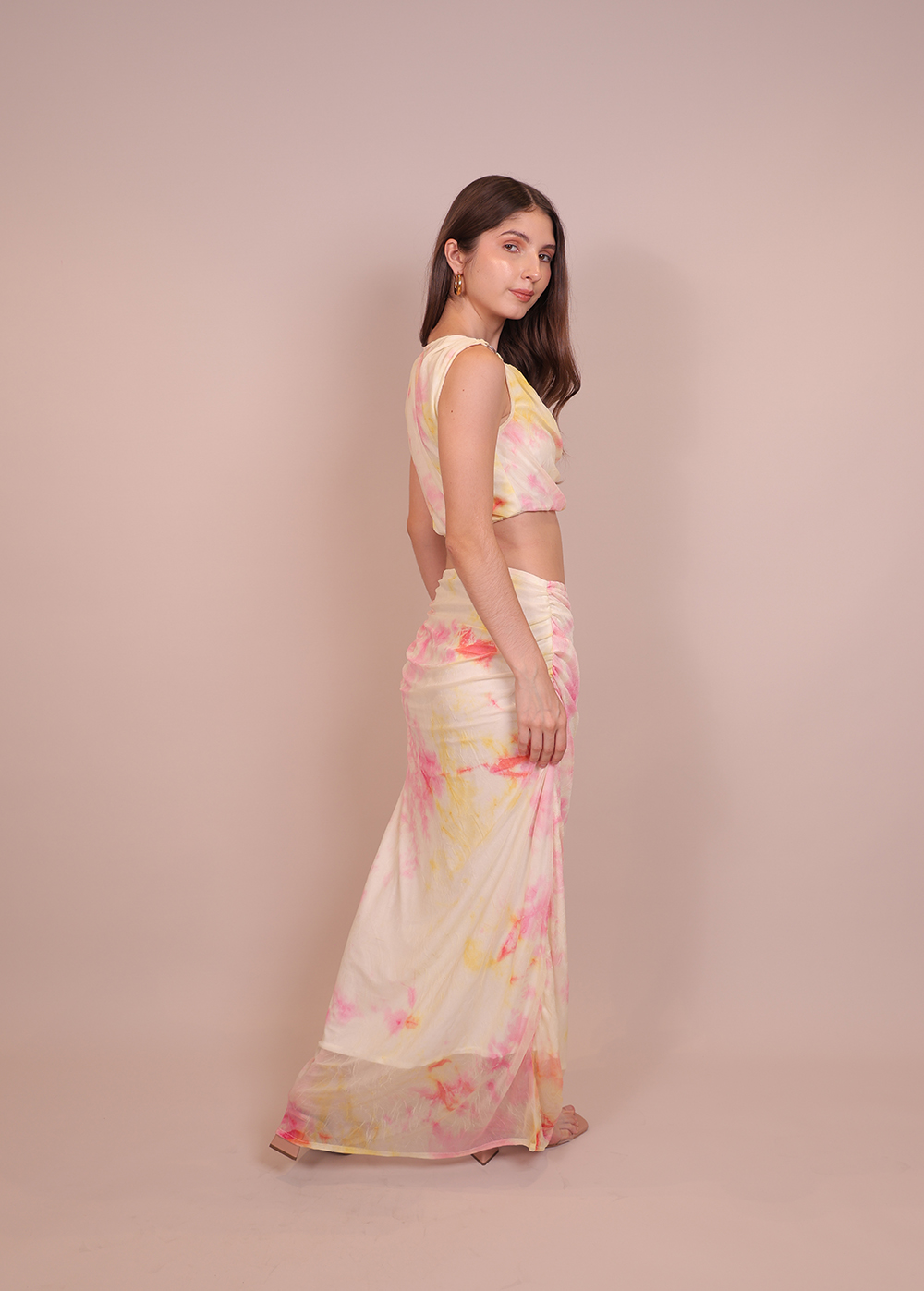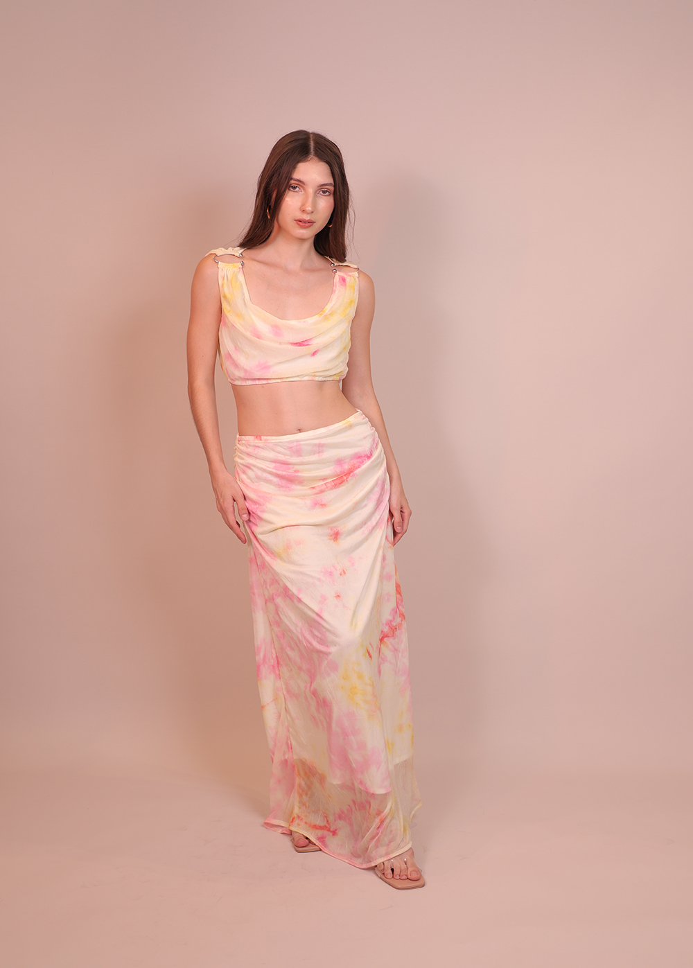 This dreamy pastel co-ord set features a sleeveless crop top and matching skirt in soft watercolor hues of pink, yellow, and white - perfect for a breezy, summer-ready look.