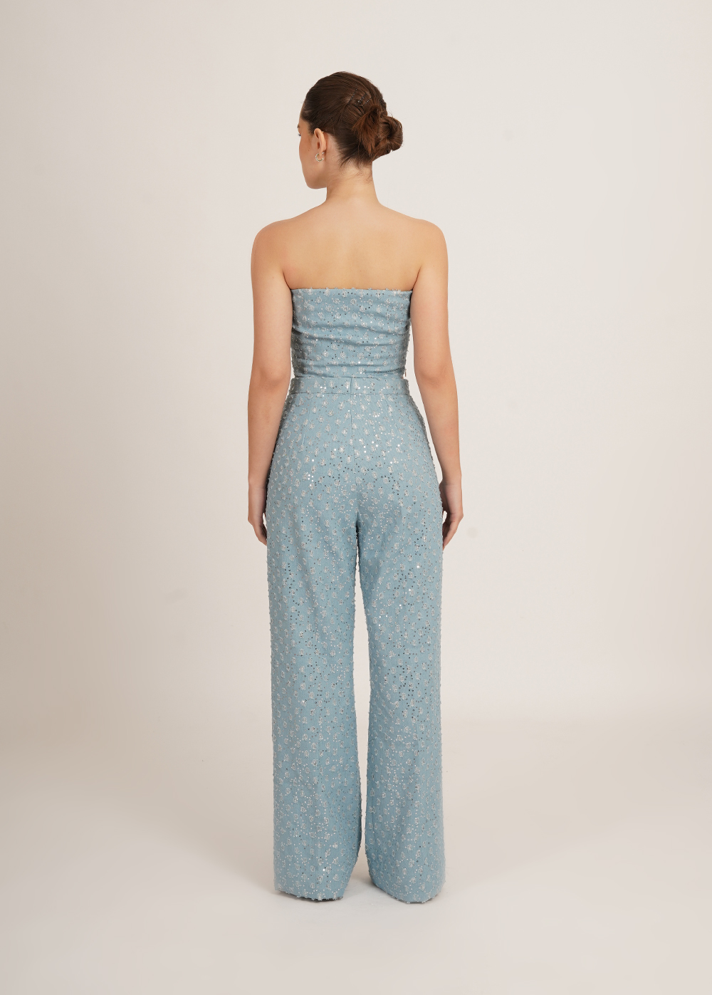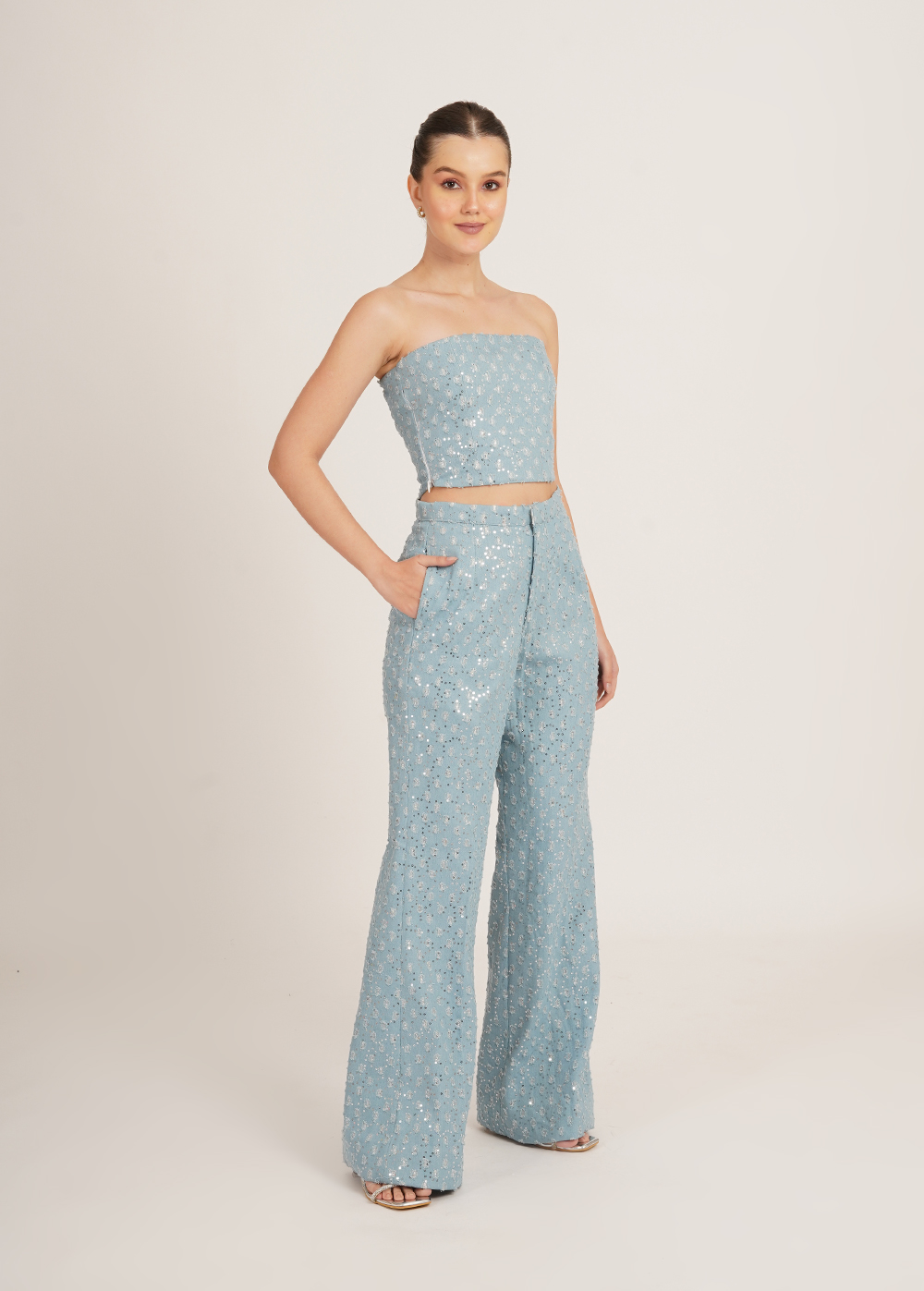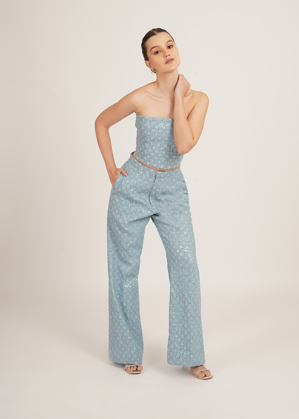 Description: A fresh take on denim with a hint of sparkle. This statement set features a structured tube top paired with high-waisted pants, both crafted in embellished denim that adds subtle shine to the cool, icy hue. Modern, flattering, and effortlessly striking.