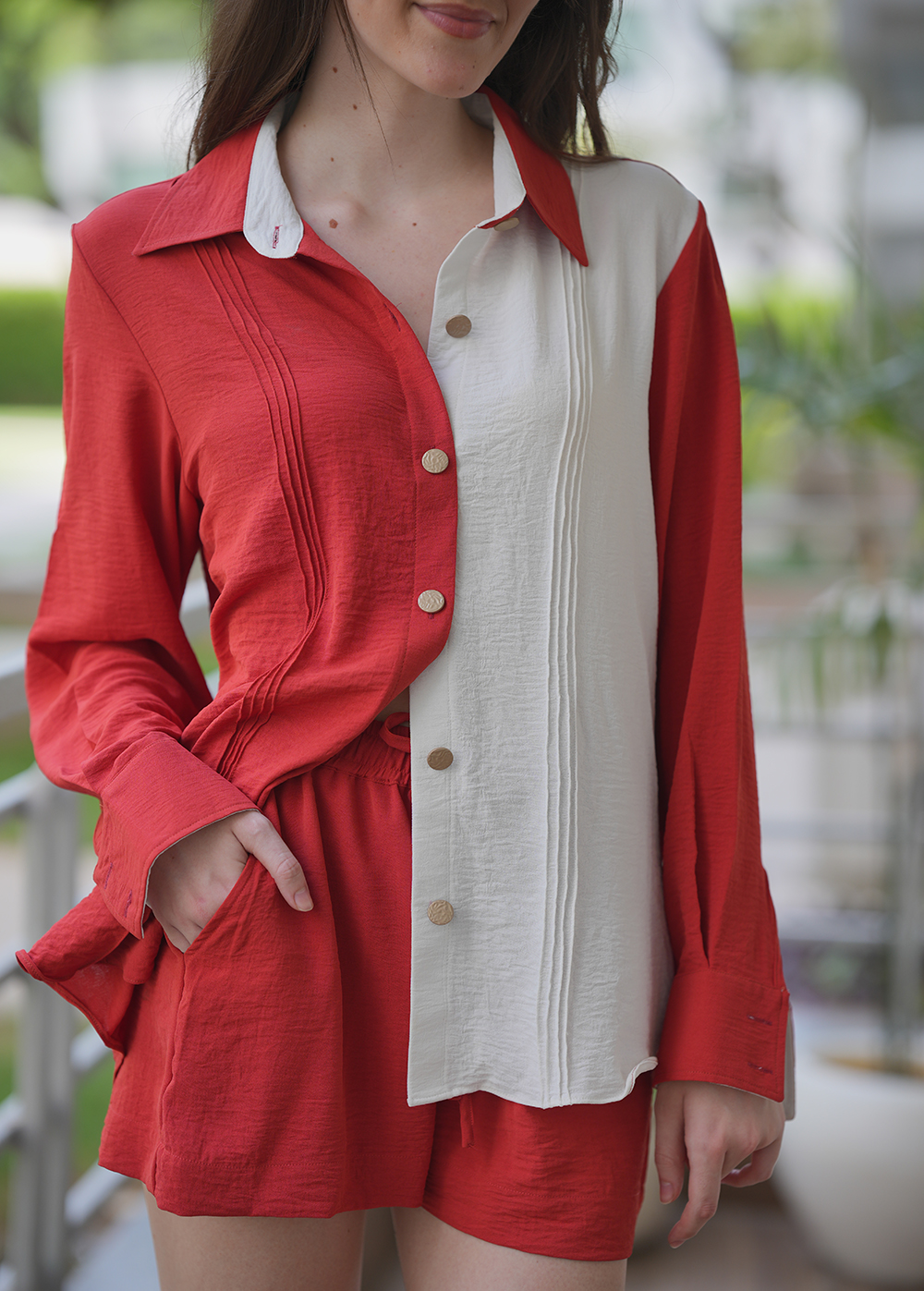 The Hazel Shirt & Shorts Set features a breezy two-tone shirt in rust orange and white, paired with matching rust orange shorts—fun, fresh, and perfect for sunny days.