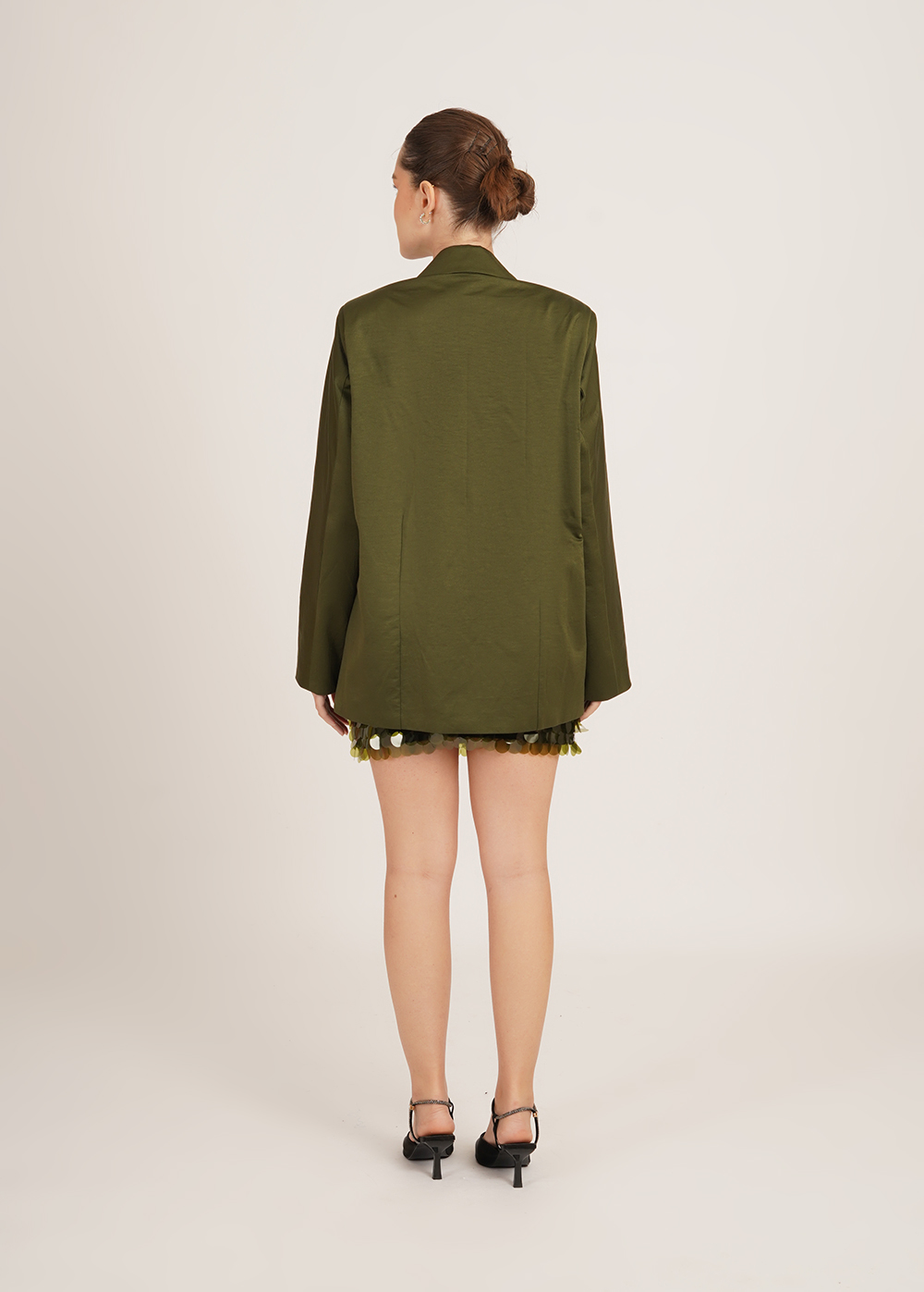 Description- Sharp tailoring meets high-glam drama. This sleek blazer is paired with a dazzling disc sequin mini skirt, reflecting light with every step. Bold, confident, and ideal for after-dark dressing.