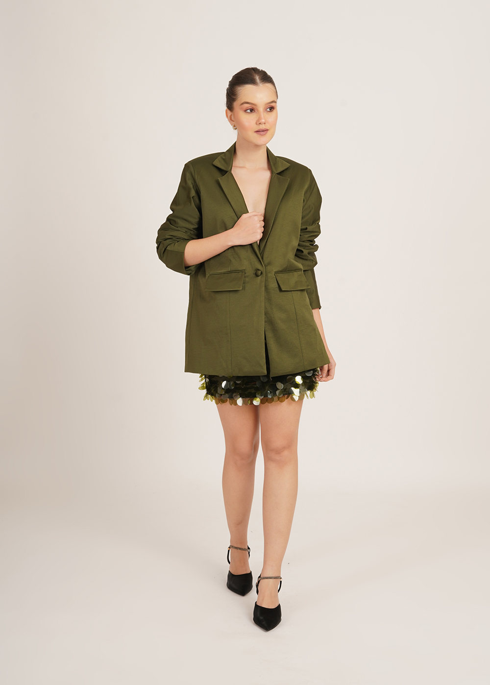 Description- A statement disc sequin mini skirt designed to add shimmer and movement, perfectly complementing the Hazelnut Blazer for a bold evening look.