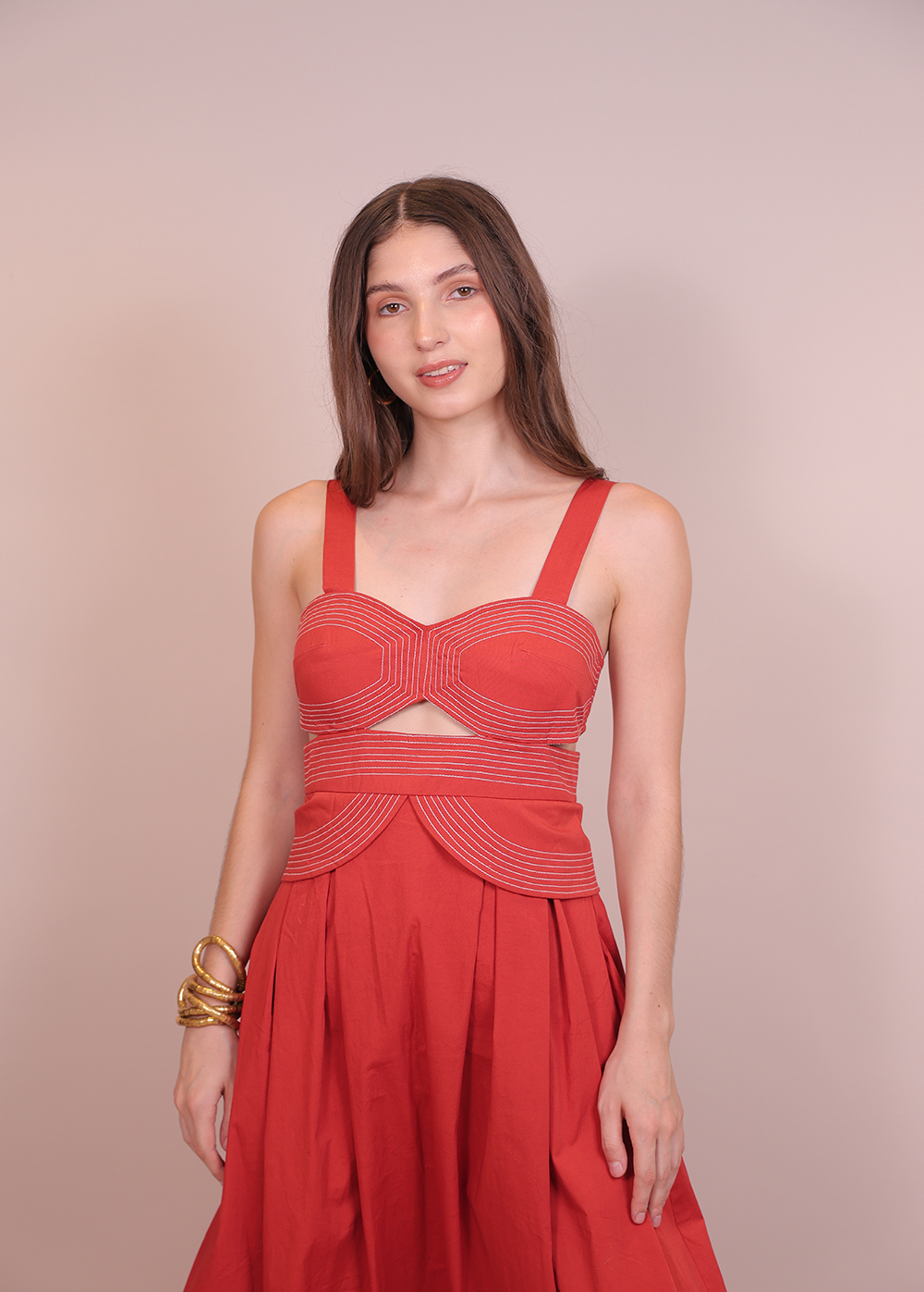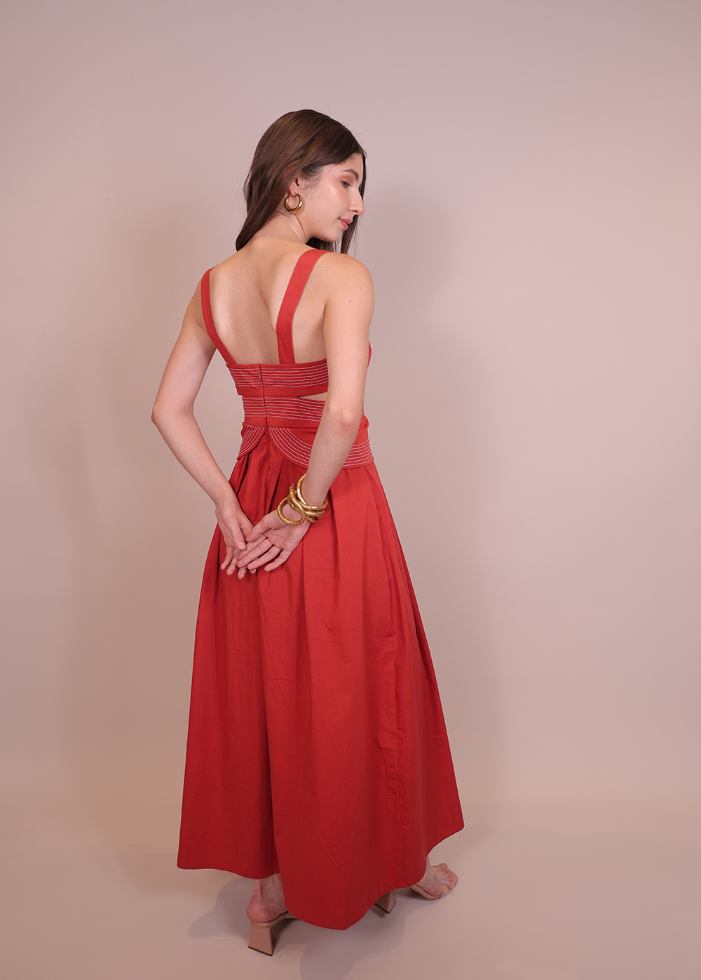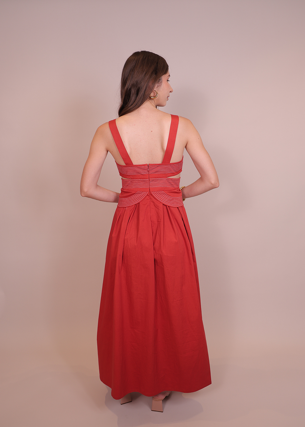 The Lucy Maxi Dress stuns in a bold with a sweetheart neckline, flattering waistband, and a playful front cut-out. Its flowy silhouette is perfect for making a statement.