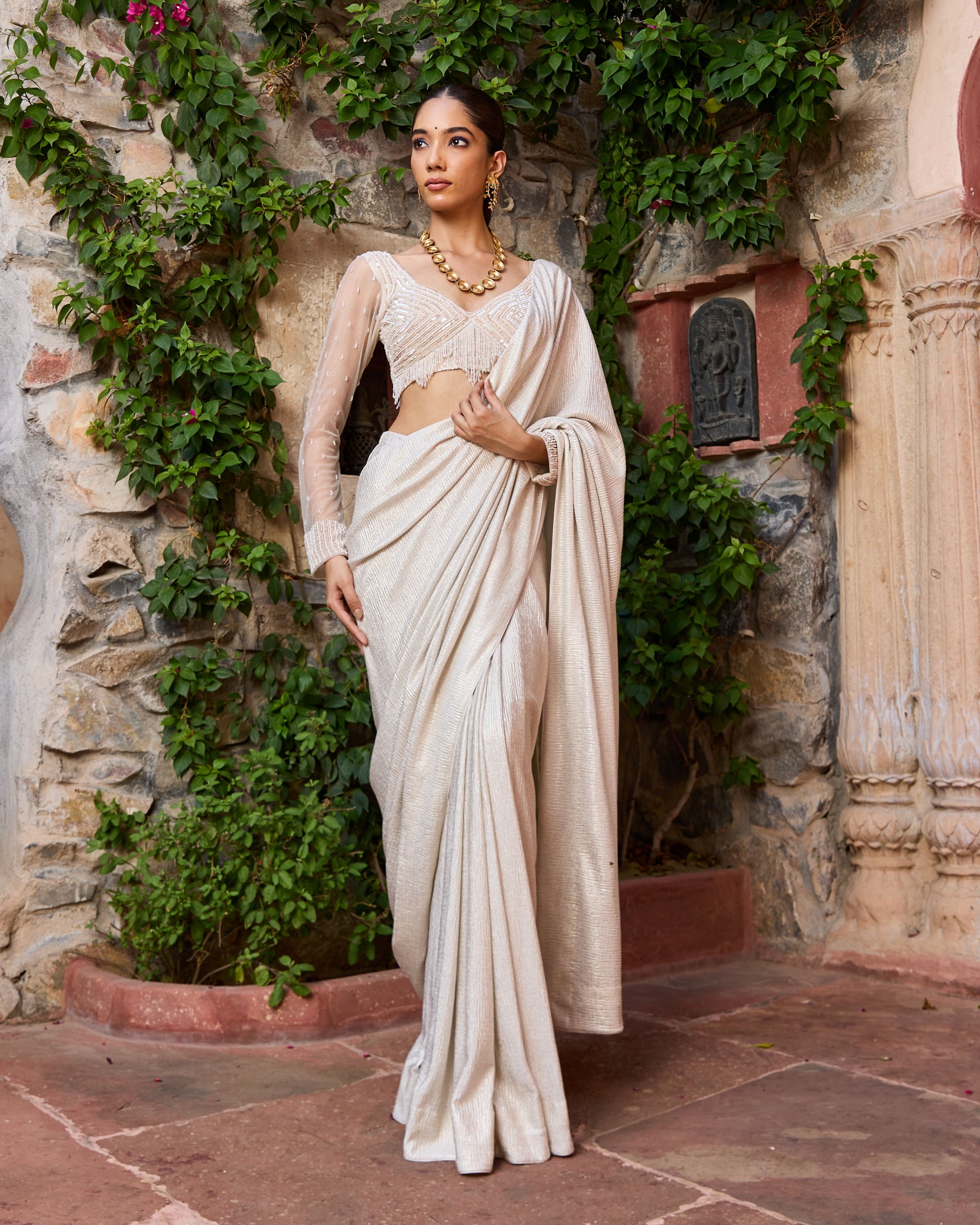 A pre-draped saree that blends ease with elegance, featuring a hand-embroidered blouse with sheer detailing.