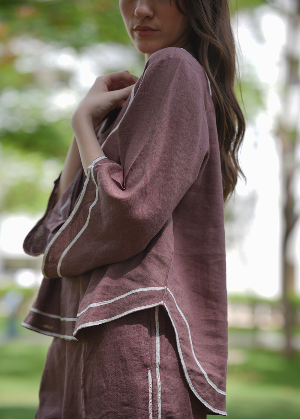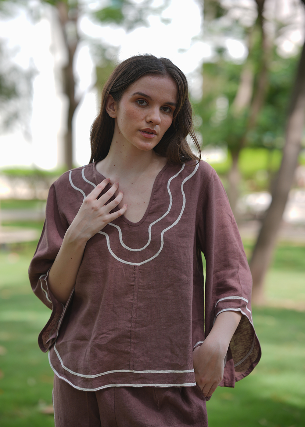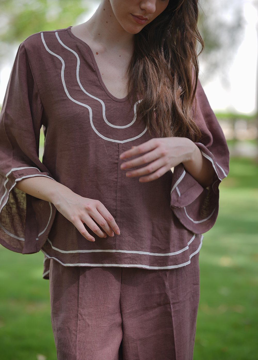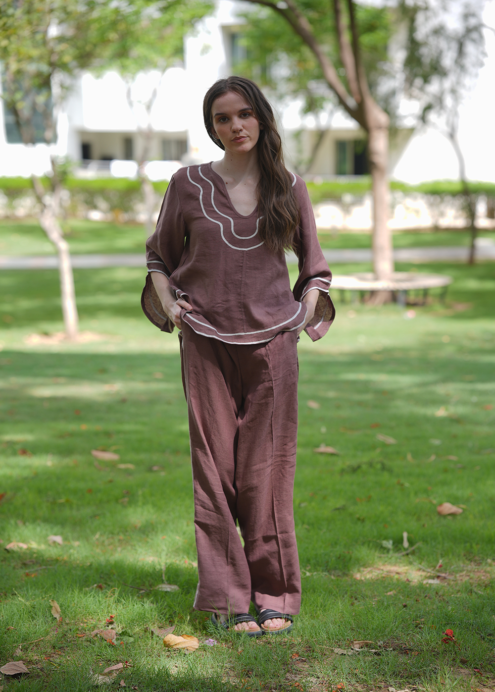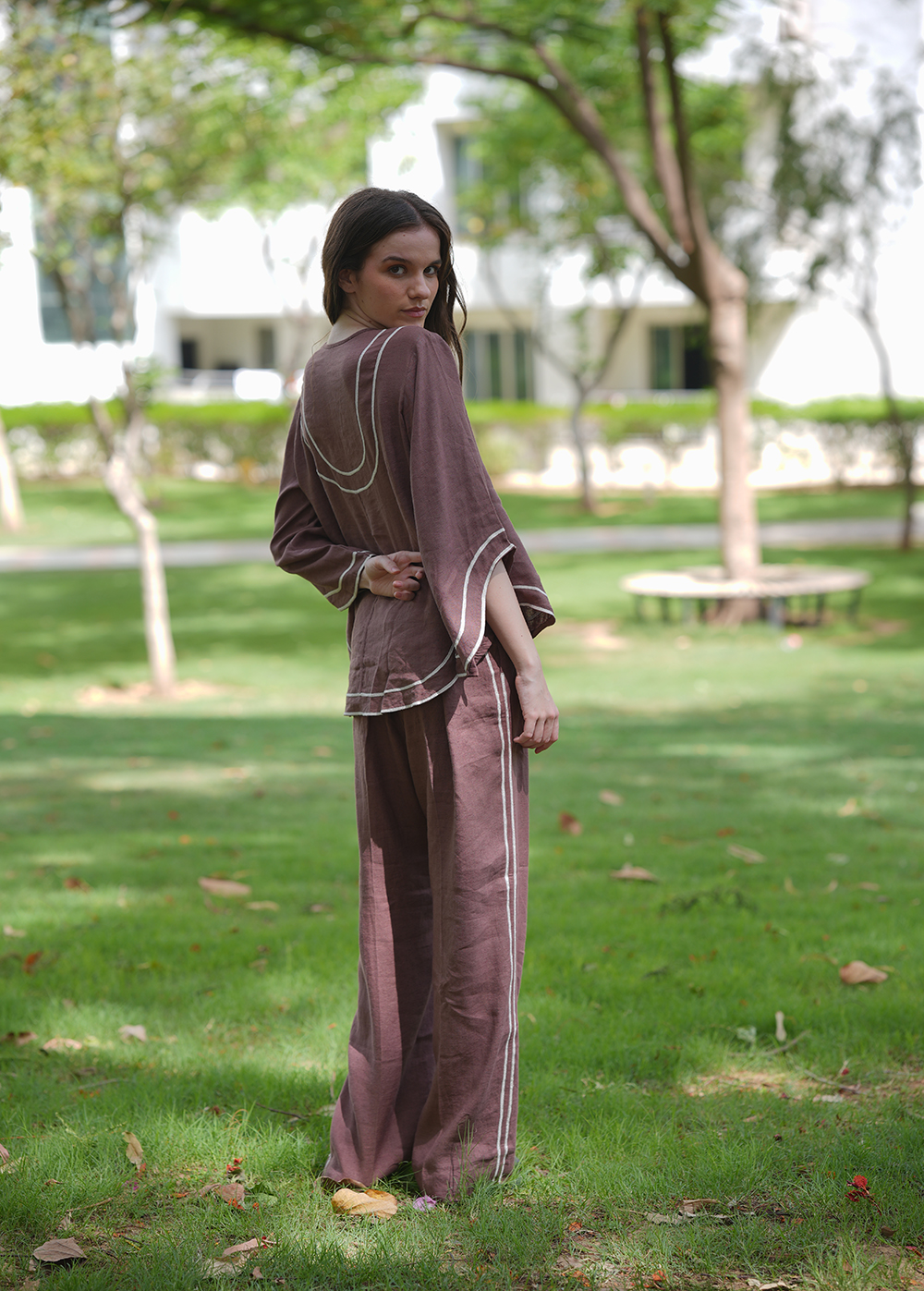 The Nutella Set is a luxe linen co-ord featuring intricate aari work detailing—earthy, elegant, and effortlessly stylish.