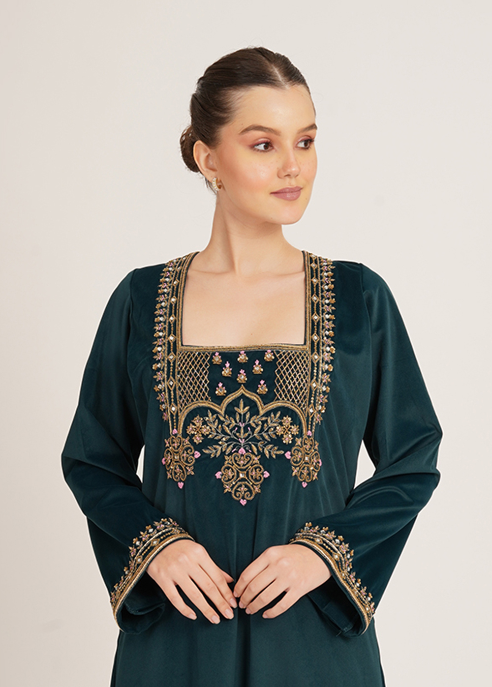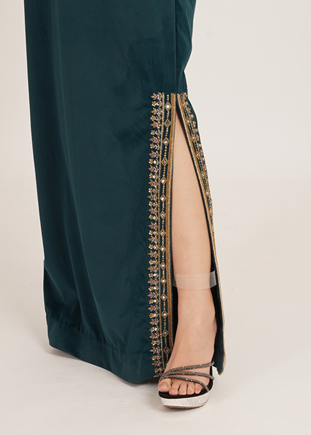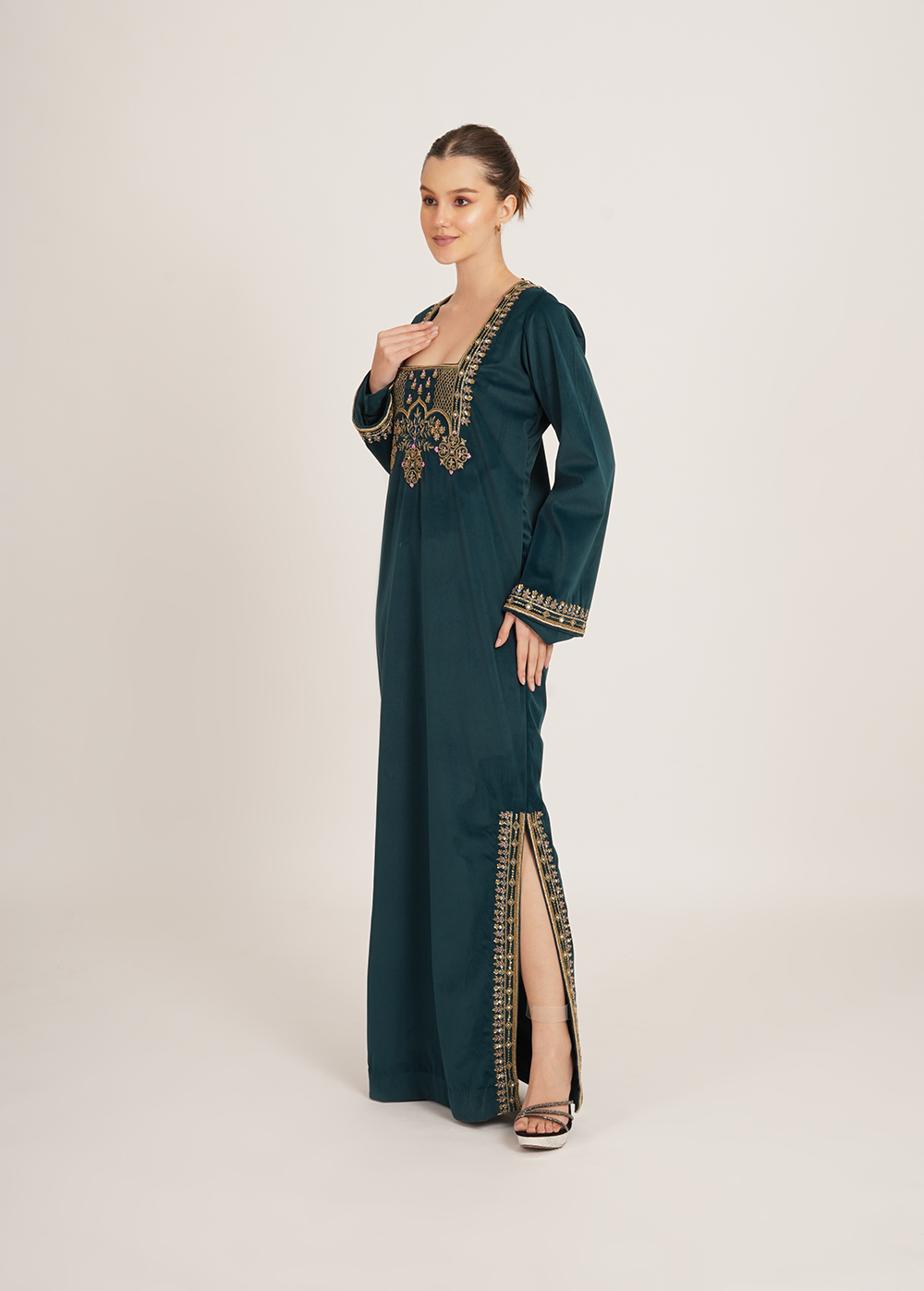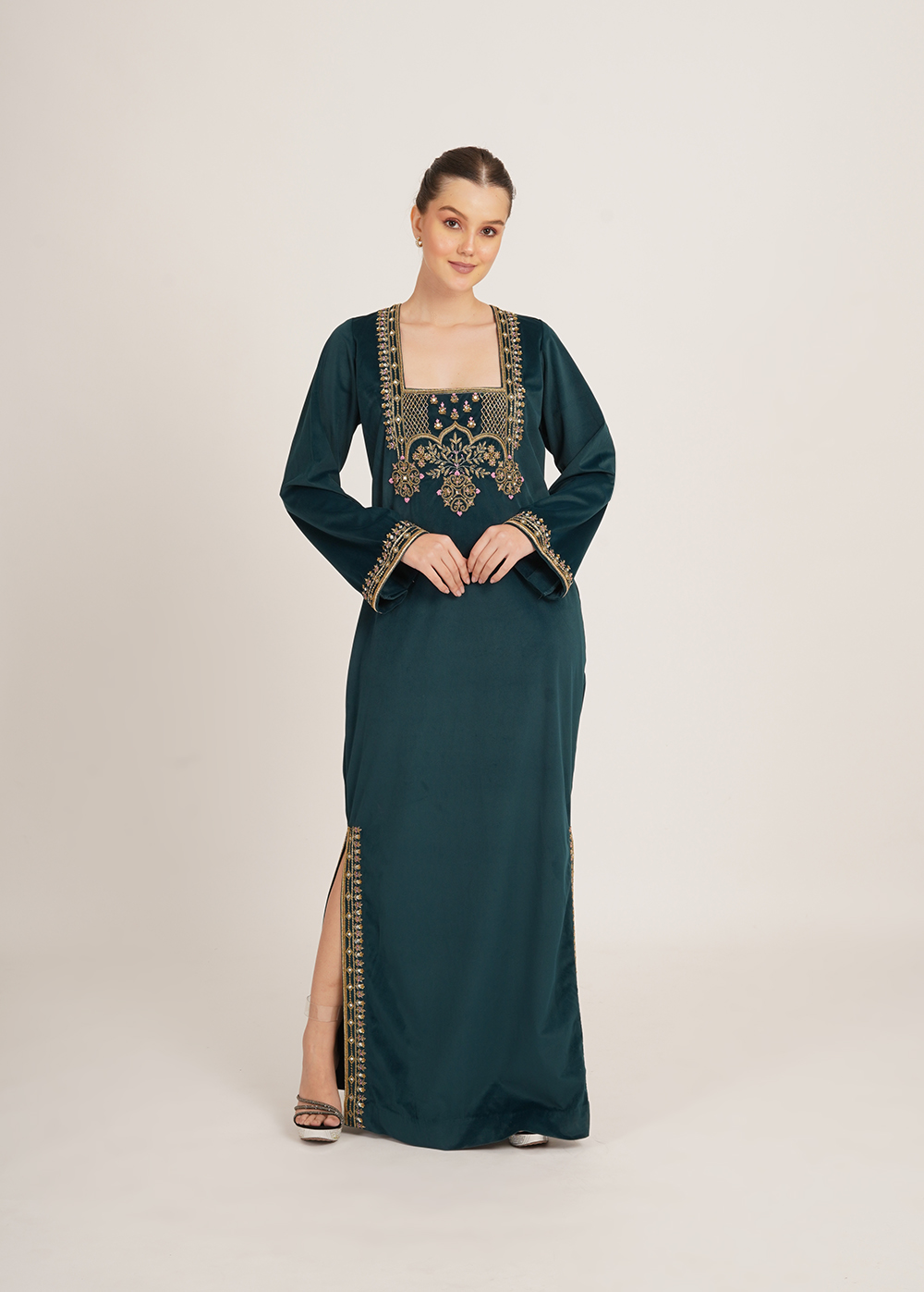 Description- A statement kaftaan crafted in luxurious imported velvet, featuring intricate handwork and sleek side slits that add effortless elegance and movement.