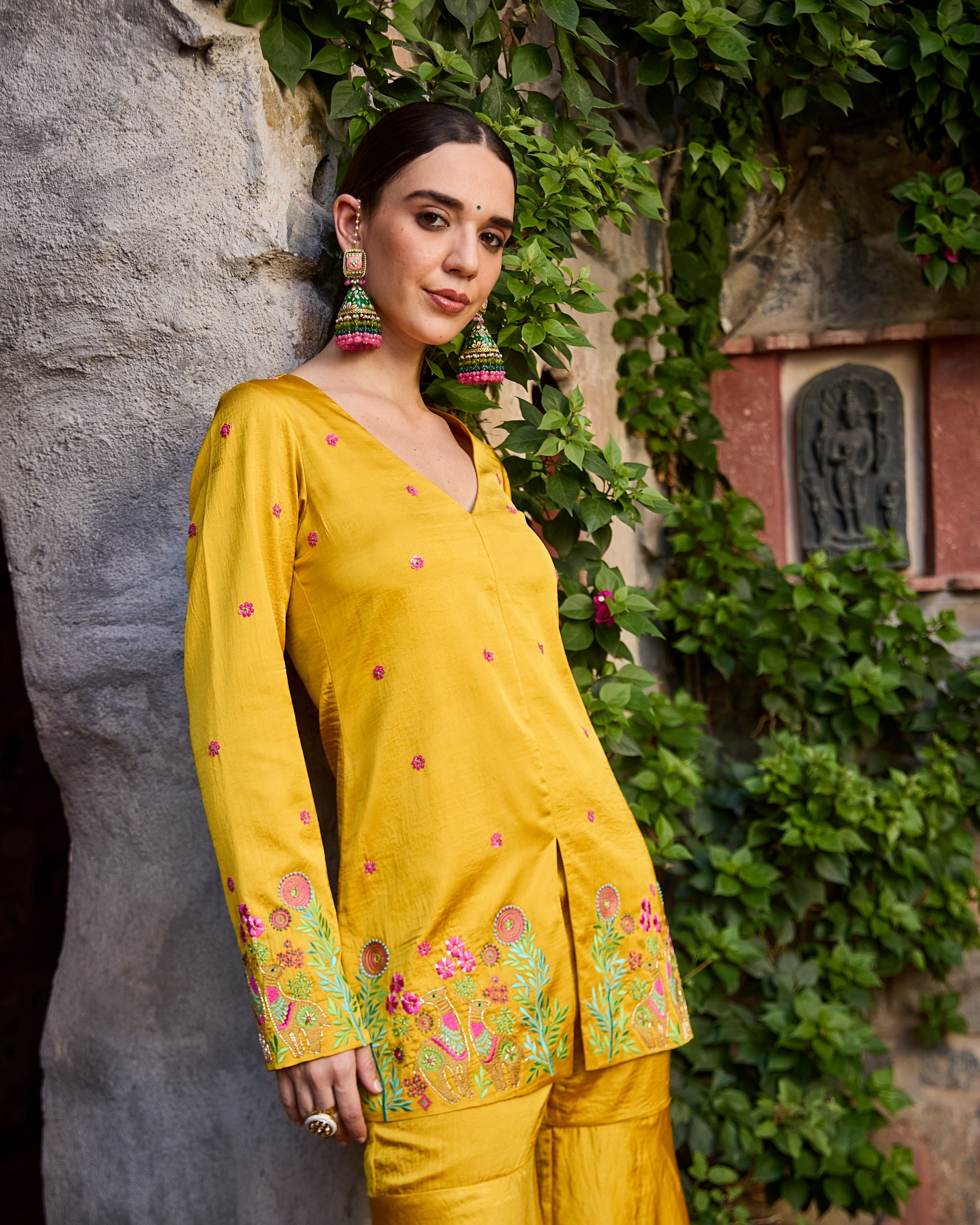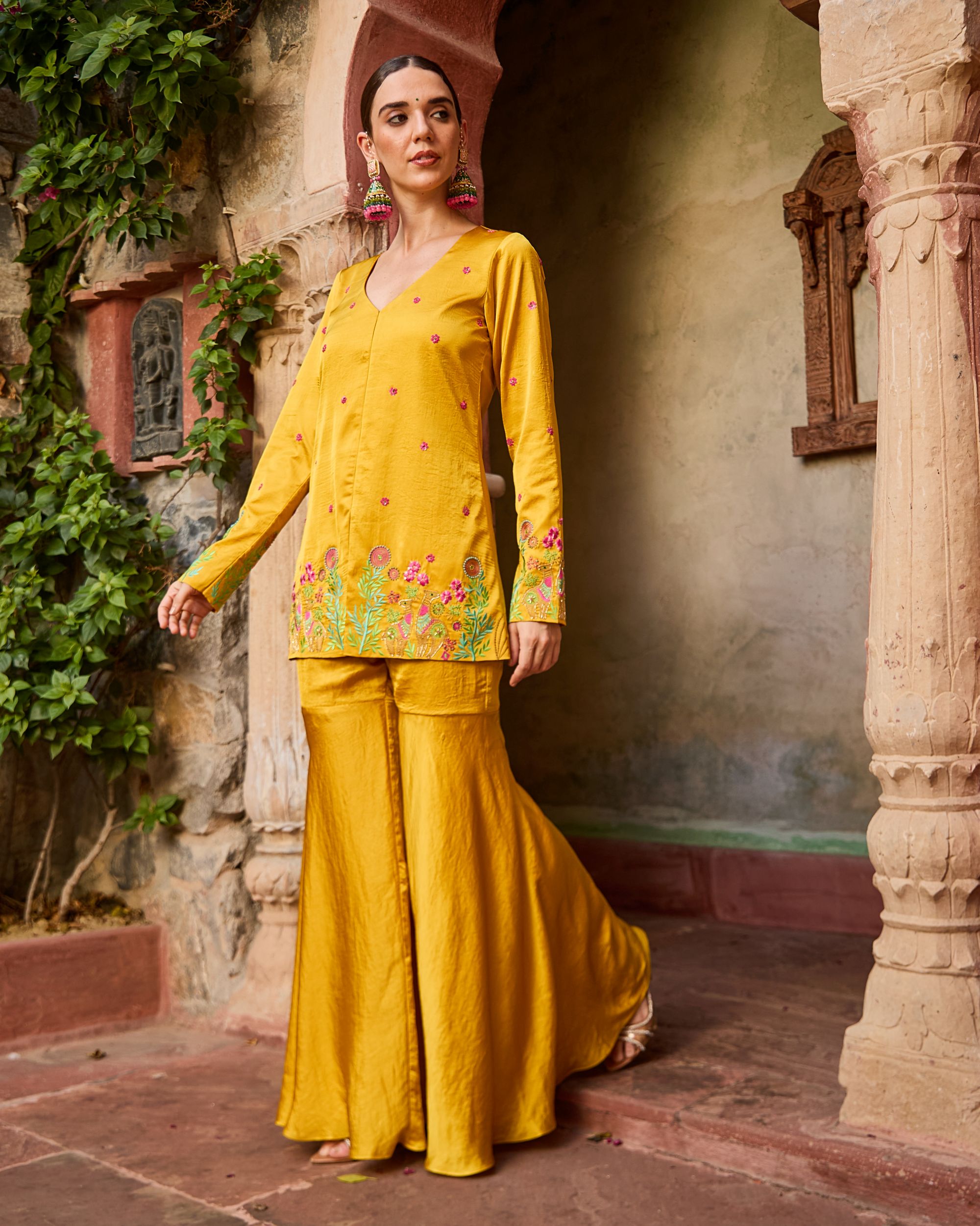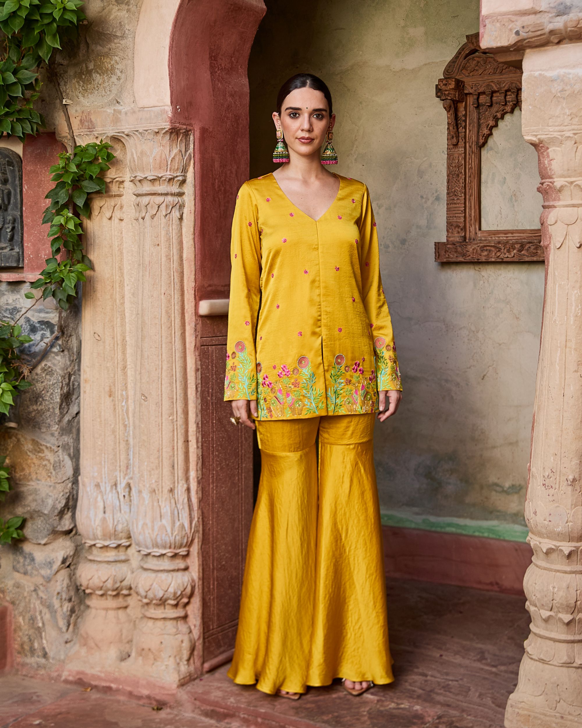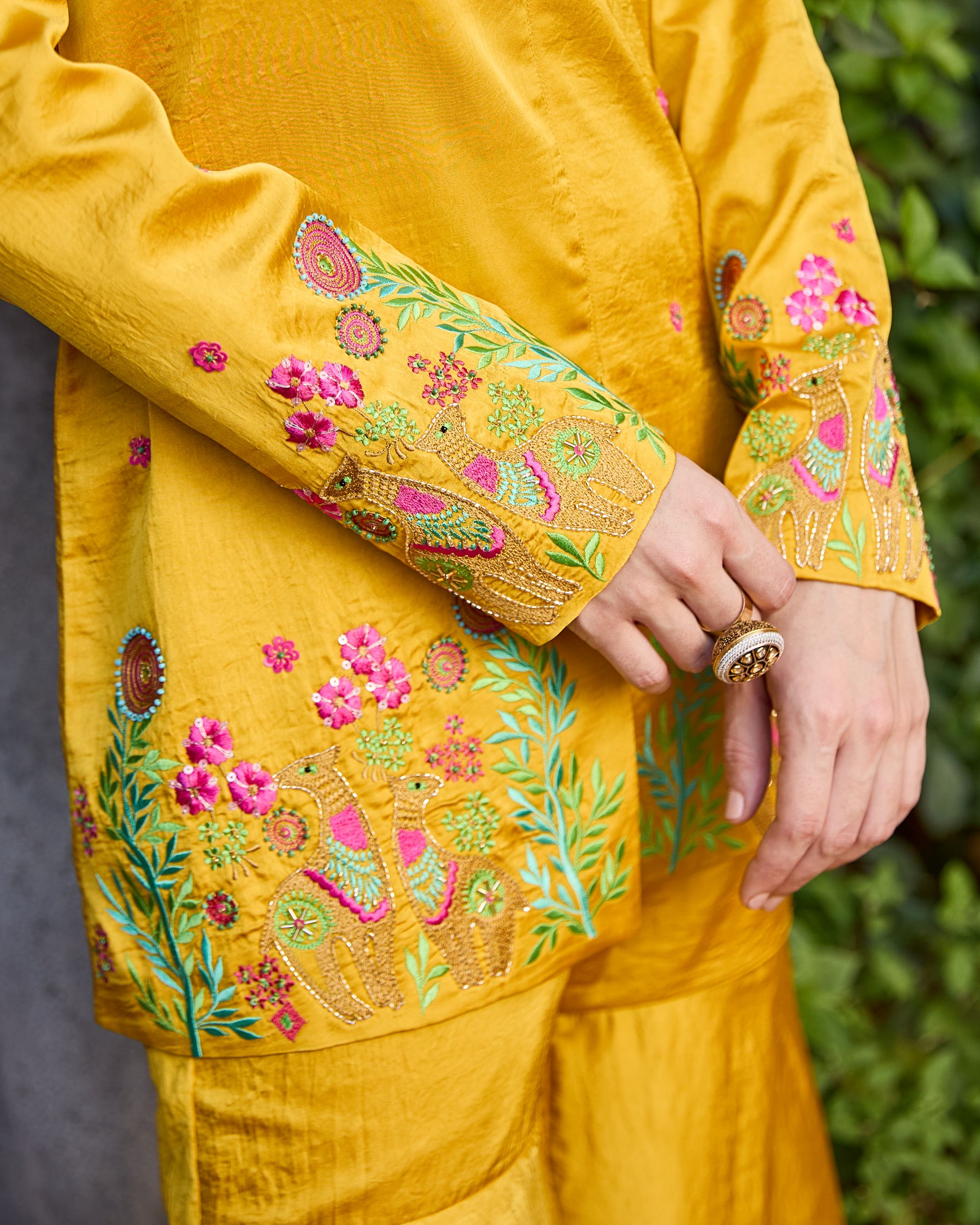 A radiant blend of tradition and modern charm, the Roohani Set features a mustard hand-embroidered kurta with floral detailing, paired with breezy wide-leg trousers. Effortless, elegant, and perfect for festive days or dreamy getaways.