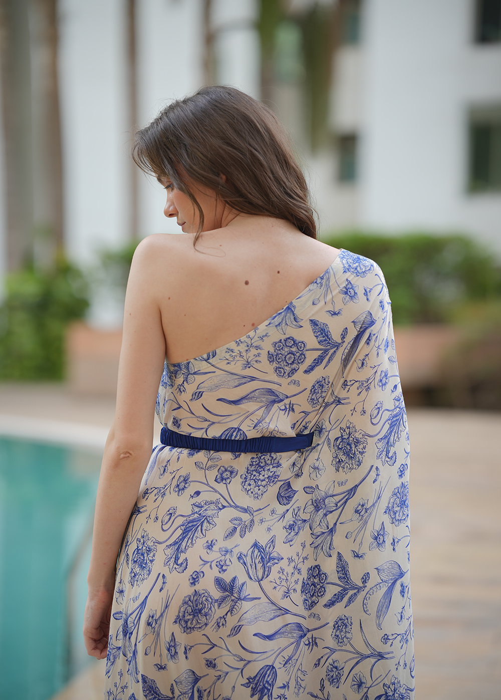 The Samantha Kaftan is a one-shoulder, breezy silhouette with a detachable belt—sophisticated, flowy, and perfect for elevated resort lounging.