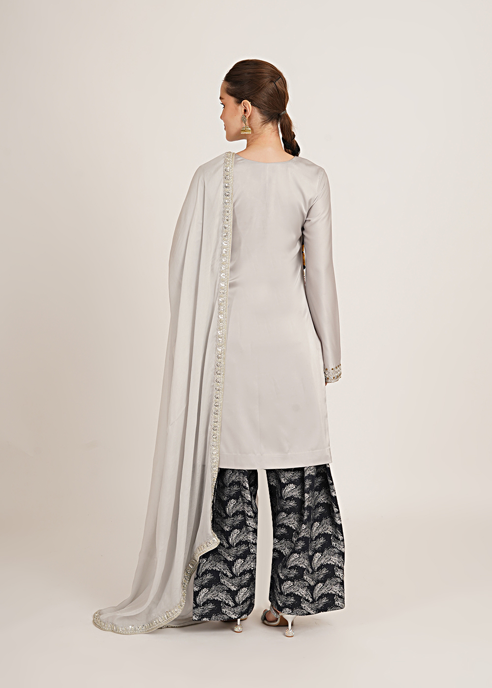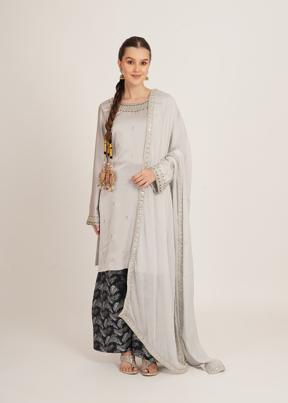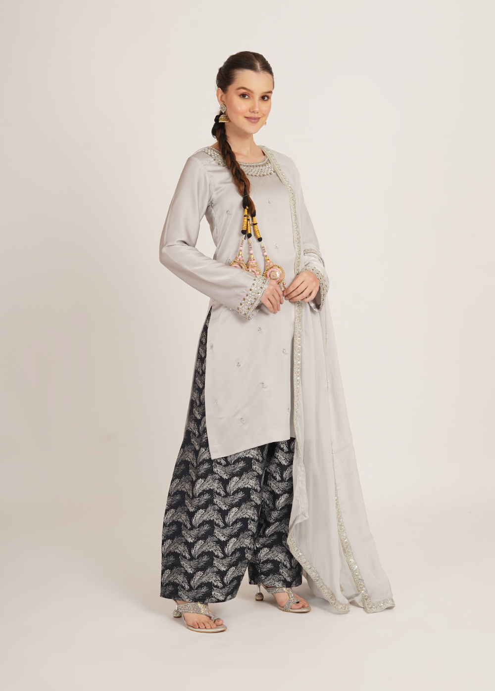 Color- Shirt & Dupatta- Light Grey, Farsi- Deep Navy Blue