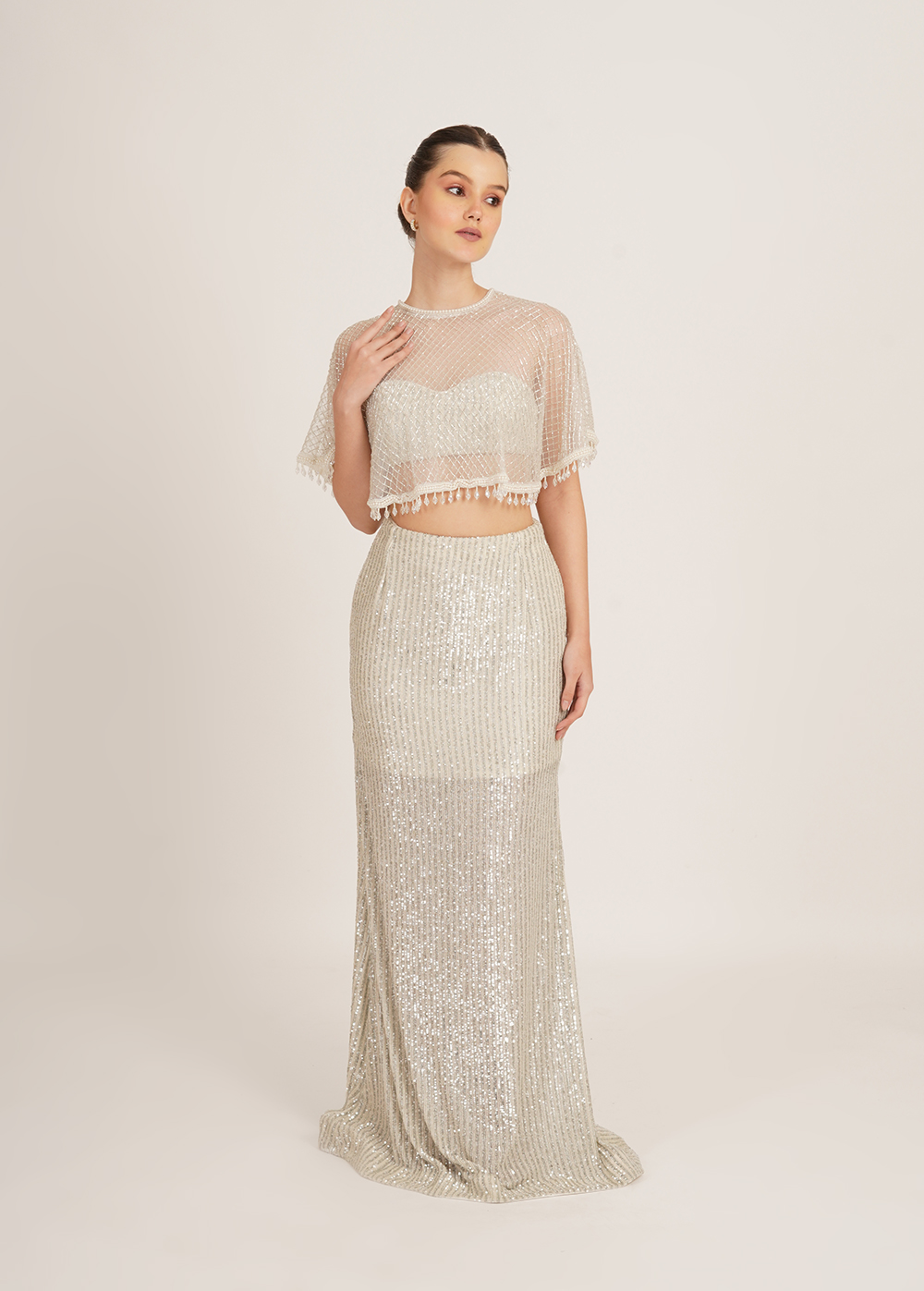 Description: Pure glamour with an effortless silhouette. This three piece set features a sculpted tube top paired with a fluid, high-waisted skirt, both richly embellished for a luminous, icy finish and full handwork detachable cape on top. Designed to move beautifully and catch the light, it’s perfect for statement evenings and special occasions.