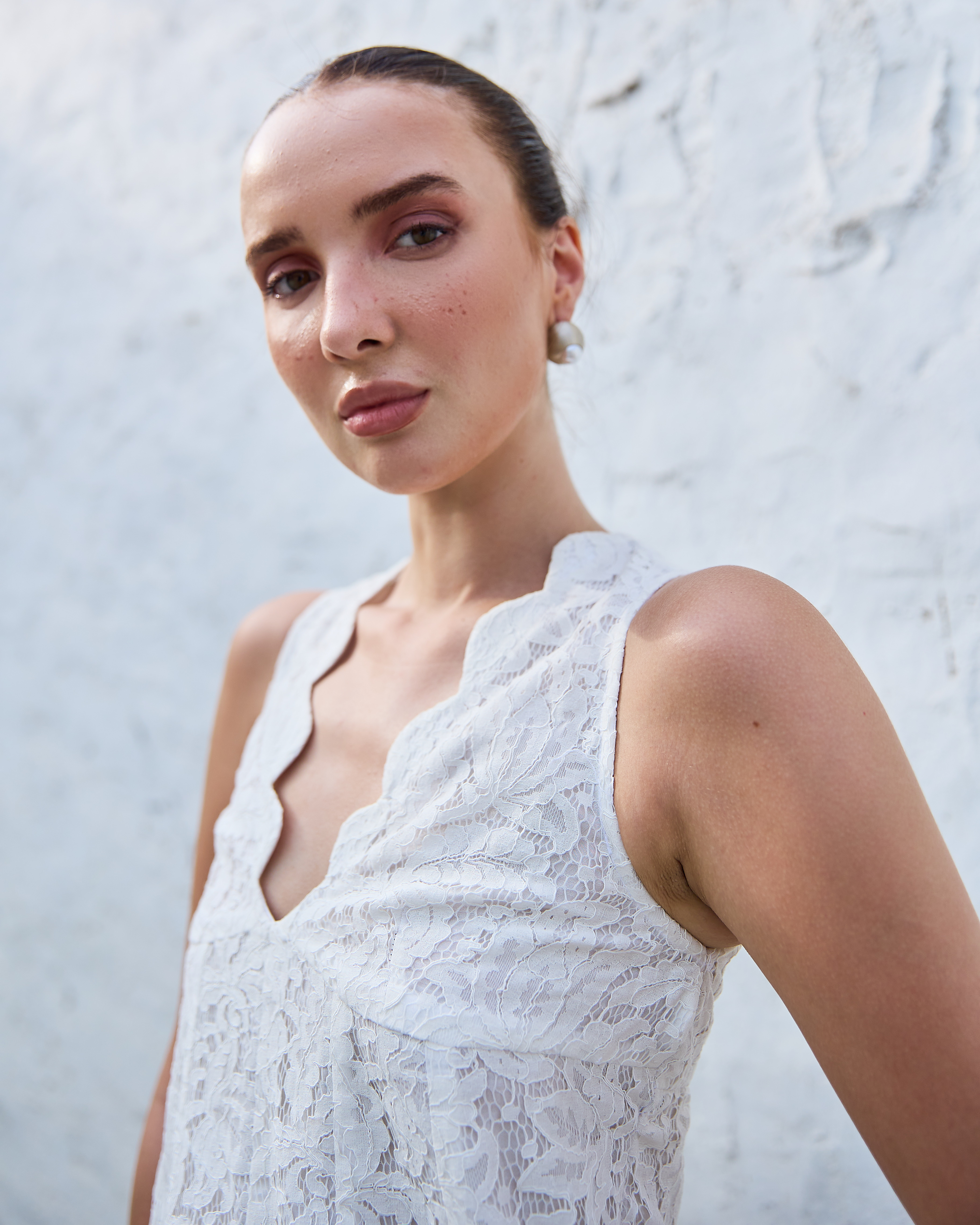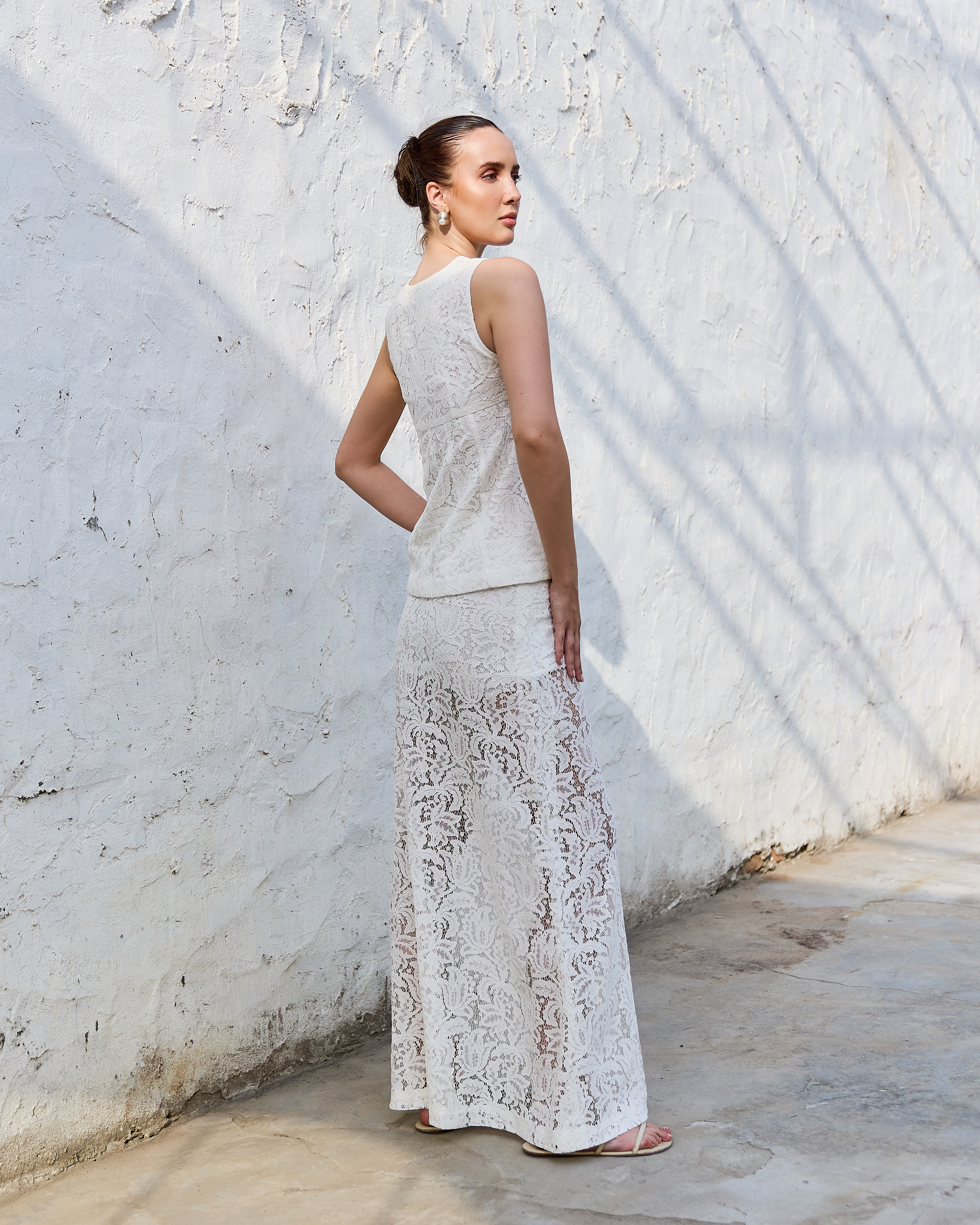 A delicate lace co-ord set featuring a sleeveless top with a scalloped neckline and a matching straight-fit skirt. Feminine, textured, and effortlessly elegant with a soft, romantic appeal.